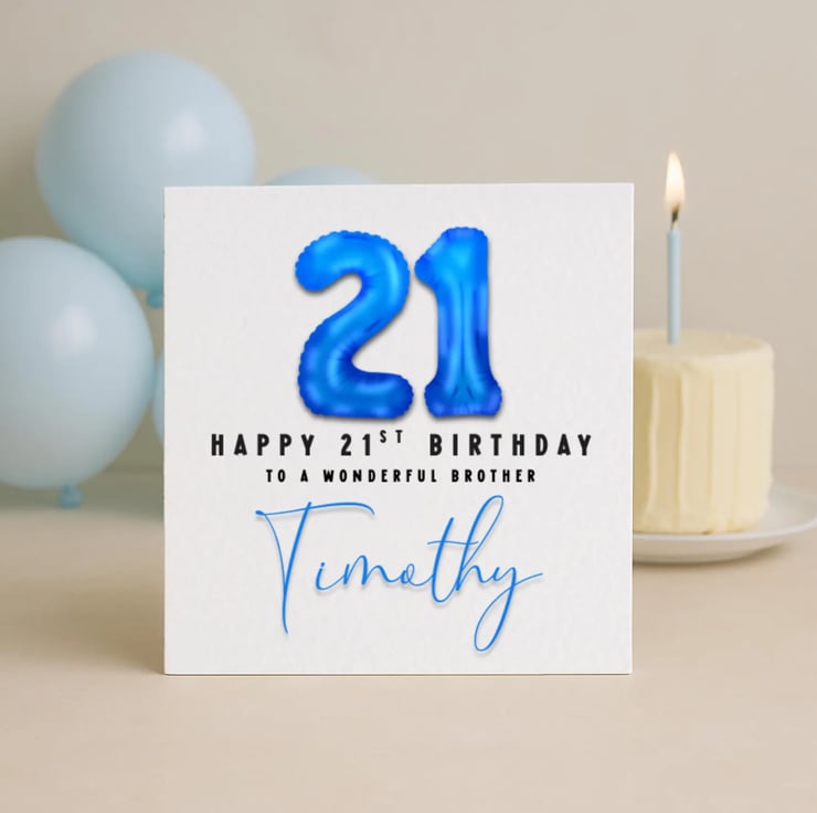 The front of the card features blue foil balloon numbers “21”, followed by Happy 21st Birthday and the NAME and custom message you provide.