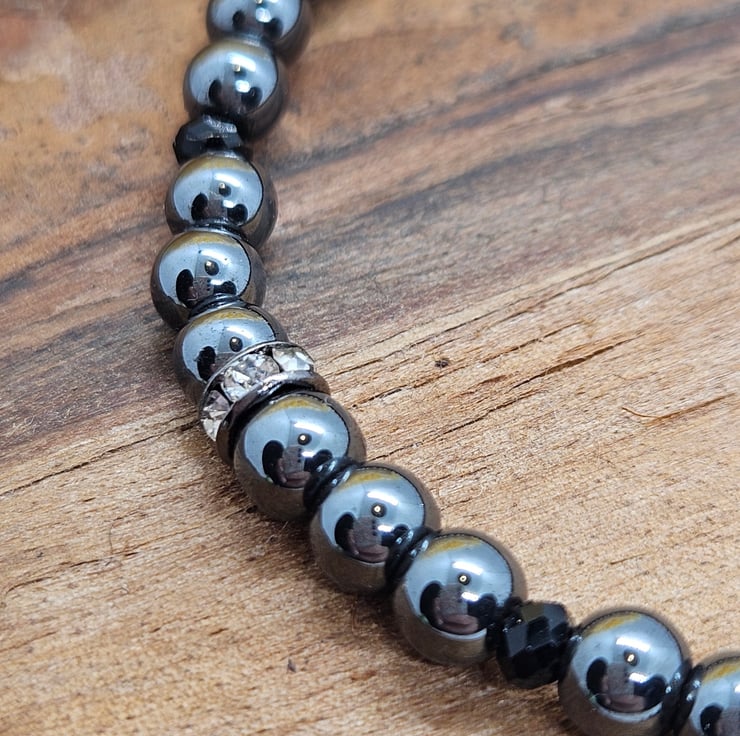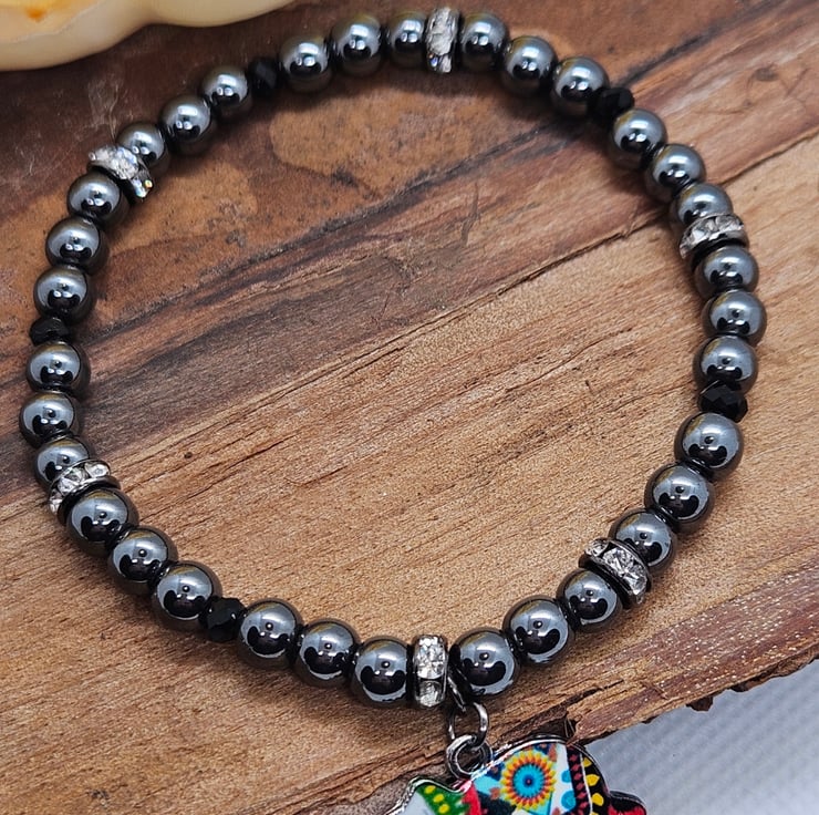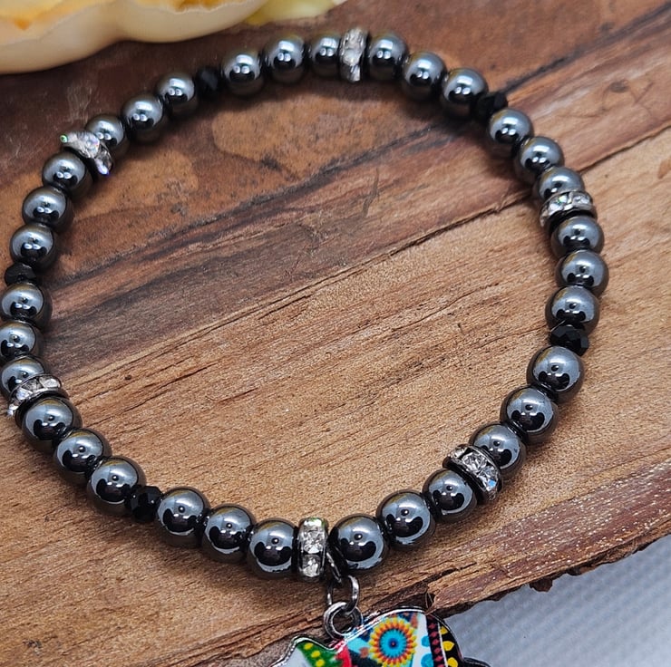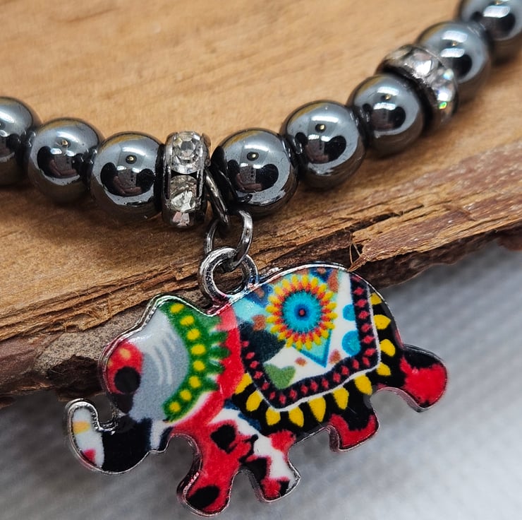 Delicate hematite bracelet with swarovski crystals and rhinestone beads with colourful elephant charm. Beautiful shiny charchoal grey/black with twinkling rhinestone and shimmering swarovski crystal set off with a brightly colourful elephant boho style charm. Elegant worn alone or make it truly boho by stacking with a wrap and other bracelets. This measures 6.5". Comes gifted in a drawstring jewellery bag and sent free of postage.