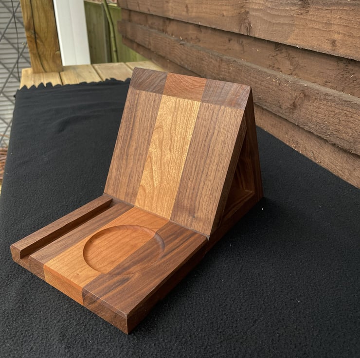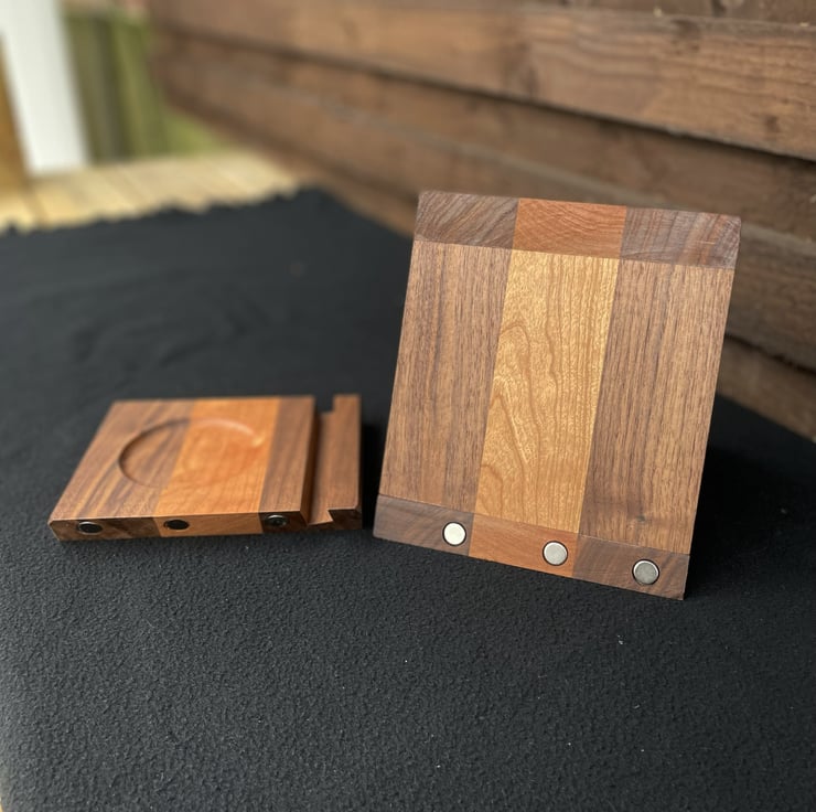 Minimalist book stand handcrafted from solid American cherry and American walnut.
