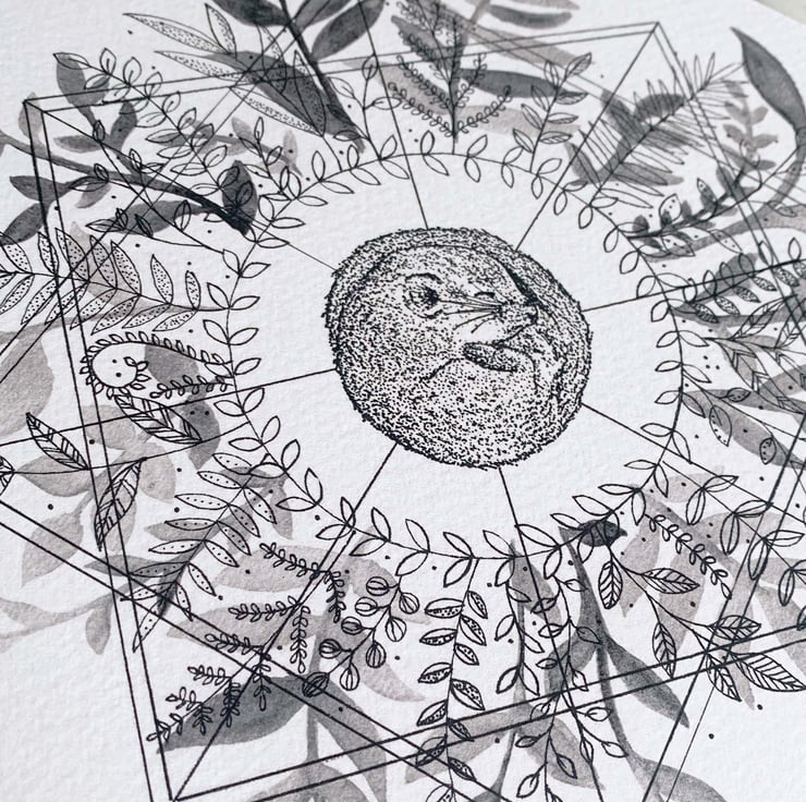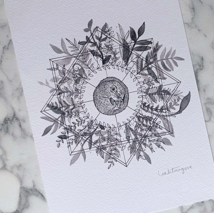 A beautifully A4 printed reproduction of my original Sleeping Dormouse illustration. A striking design that balances the juxtaposition between geometric shapes and loose painterly botanicals with a sweet Dormouse in the middle.