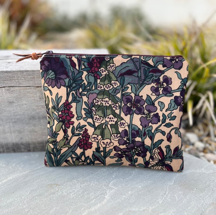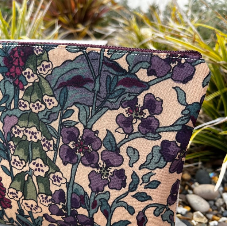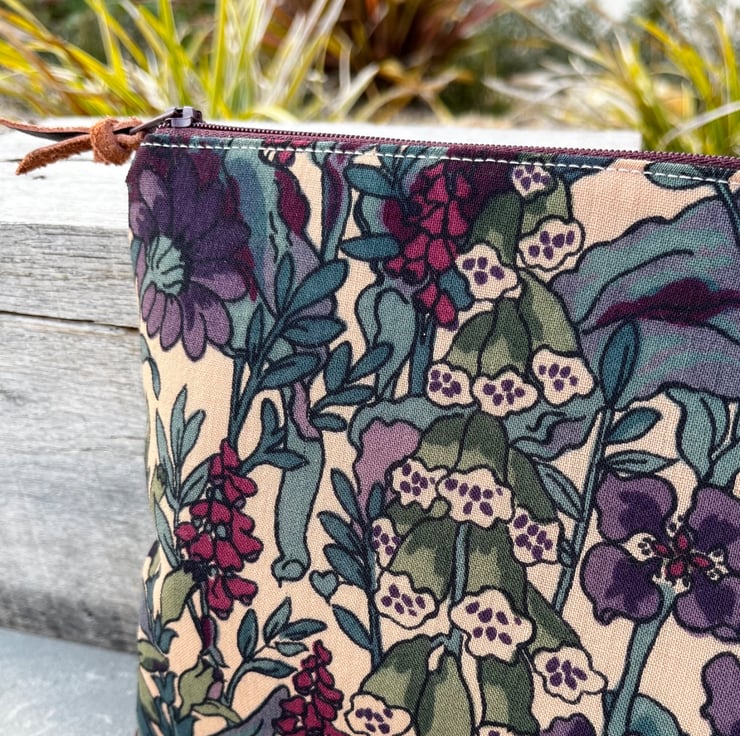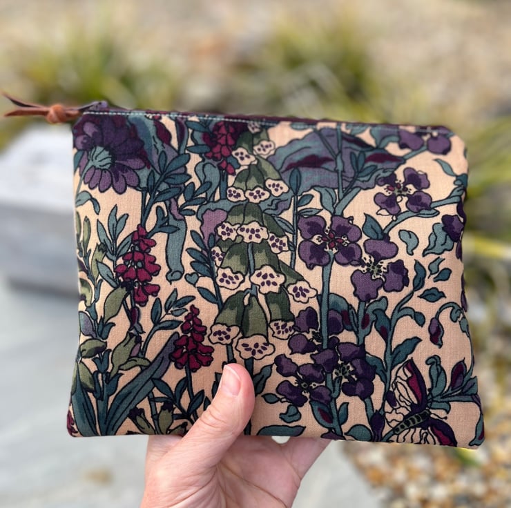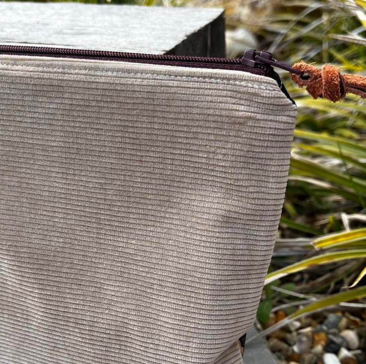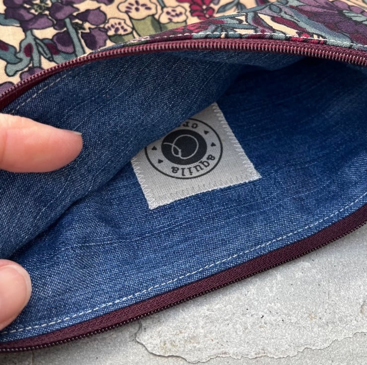 Vintage Liberty Penelope zip pouch. This little bag has been made from lightweight wool fabric from a handmade skirt and backed with beige corduroy from a sample swatch. The pouch is fully lined with lightweight denim blue cotton.