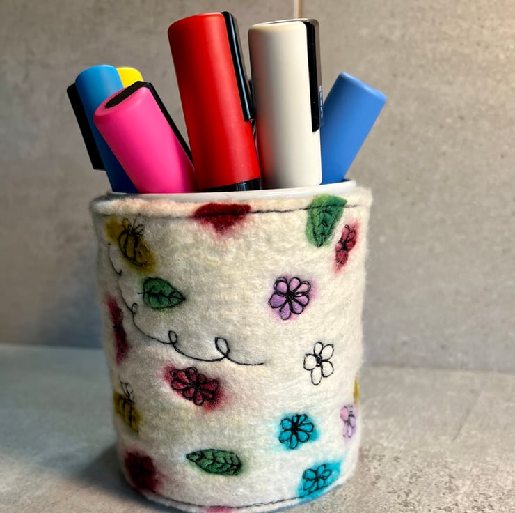 Beautiful hand made felt with colour spots decorated with free motion stitching of bees and flowers