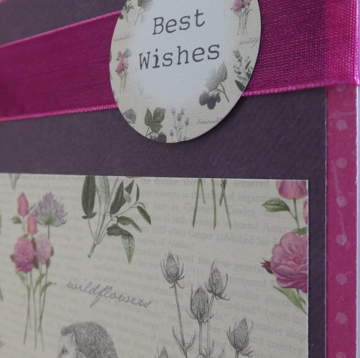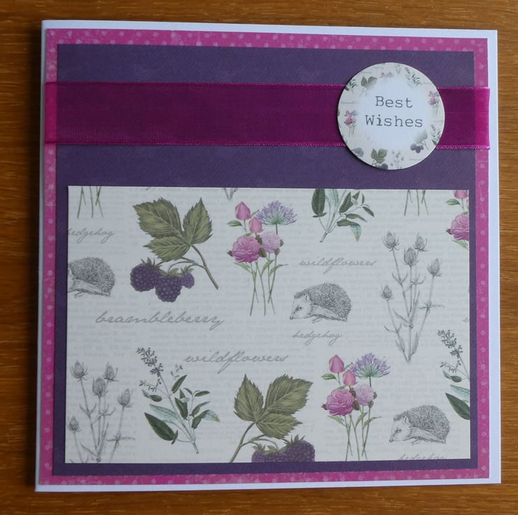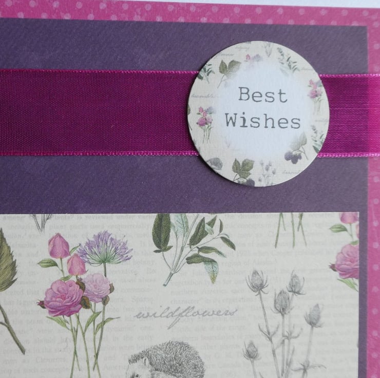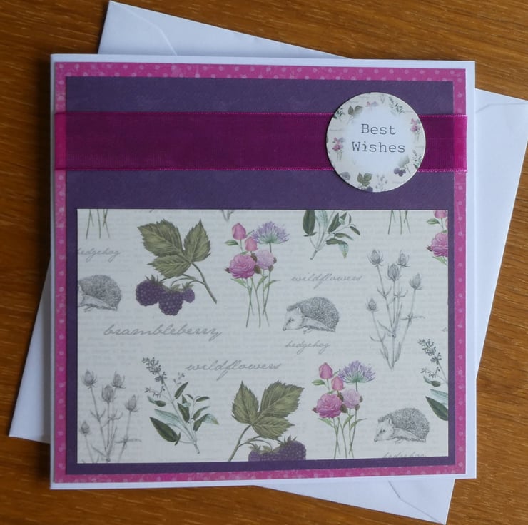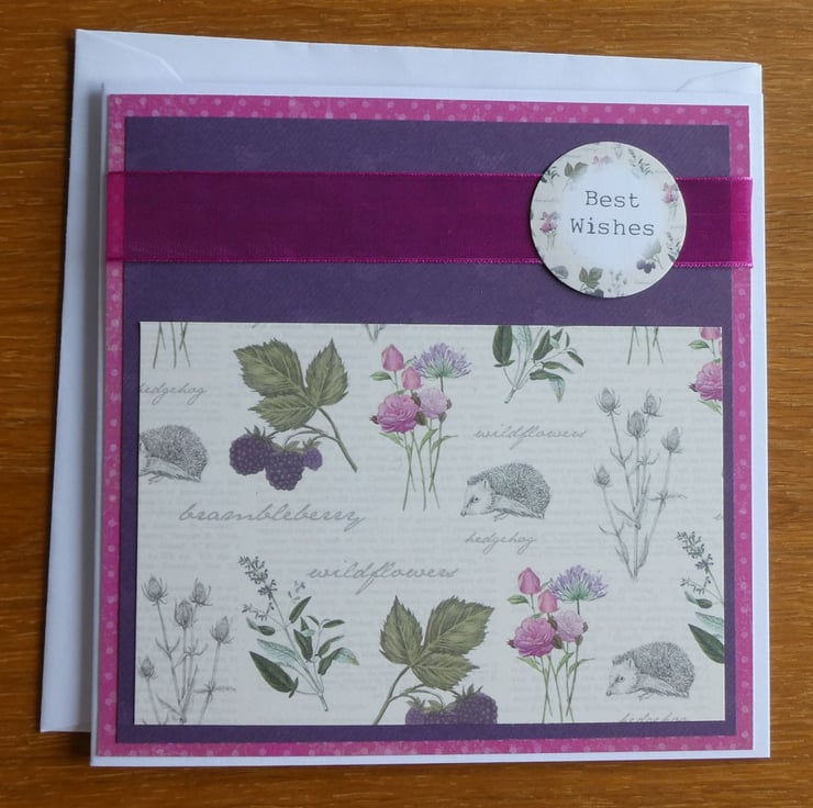 This card in shades of dusky pink, purple, green and cream has a botanical style design with a floral, bramble and hedgehog print, making it ideal for someone who loves gardening or nature. With the message Best Wishes it could be sent as a Birthday card, get well card, or for many other occasions.