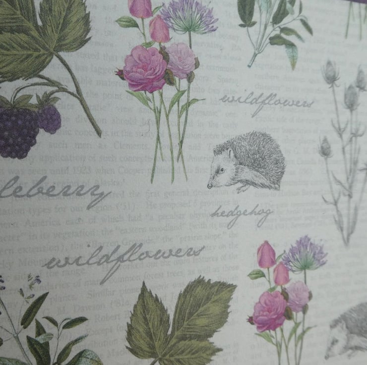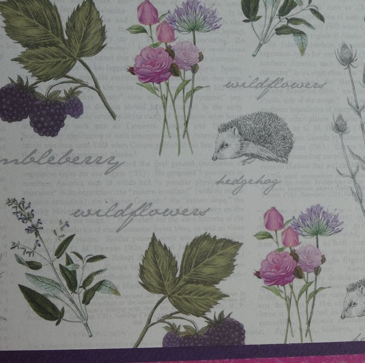 Layers of pink dotty card and purple paper have been topped with a botanical drawing style paper with a design of brambles, hedgehogs, flowers and seedheads over text on a cream base.