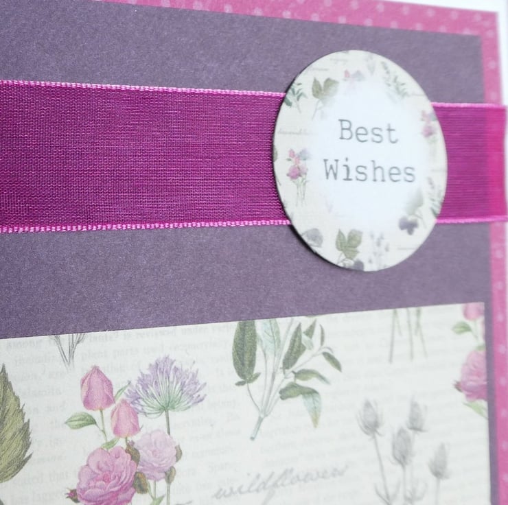 A fushia pink organza ribbon has been wrapped around towards the top and a message with the words Best Wishes added in the top right corner.