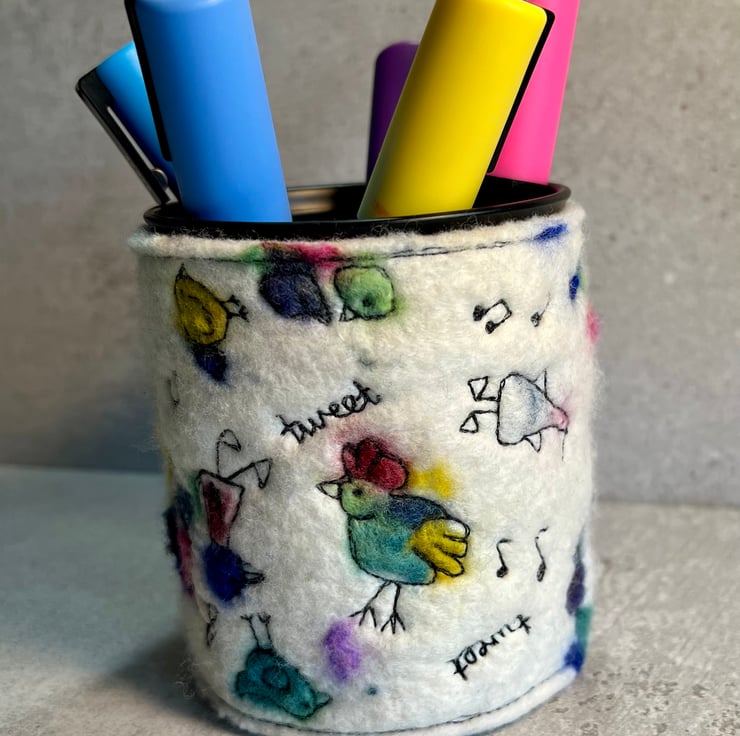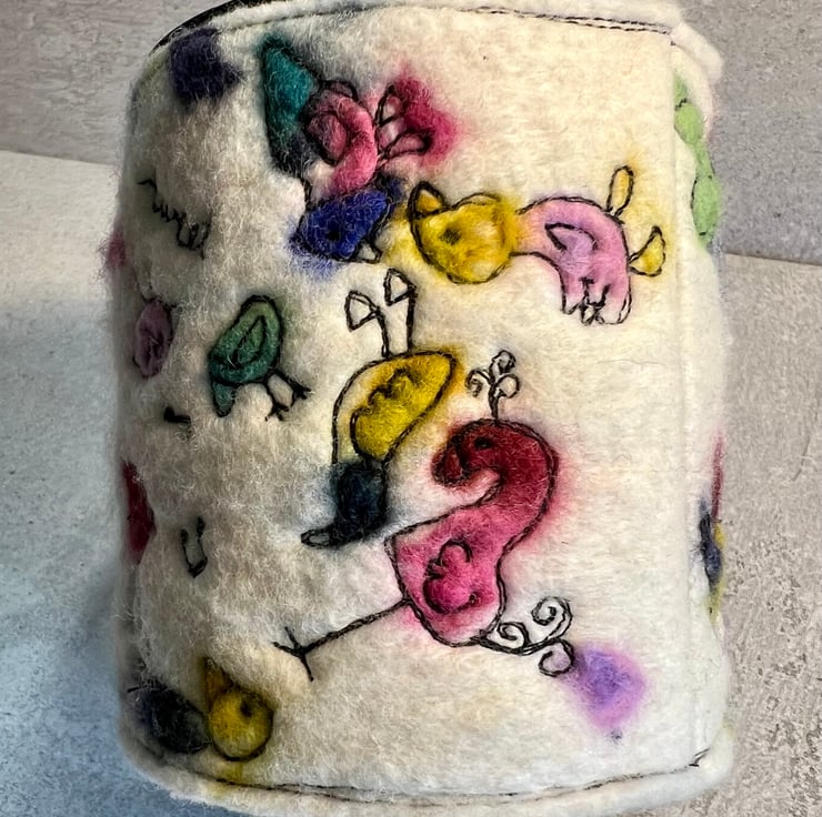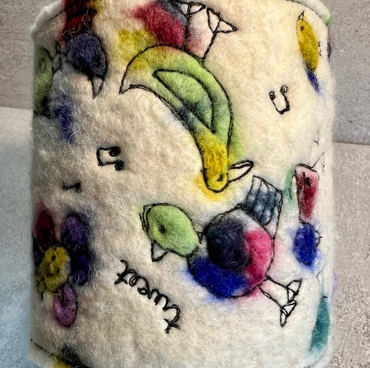 Wet felted wool with coloured dots free motion stitched to create bird designs