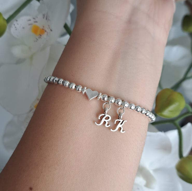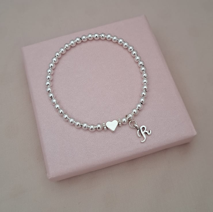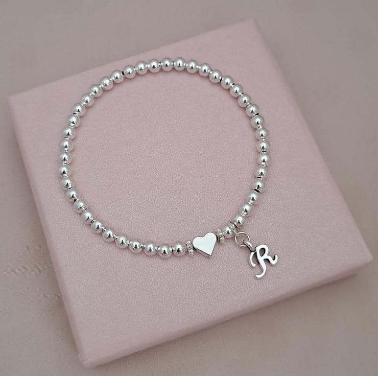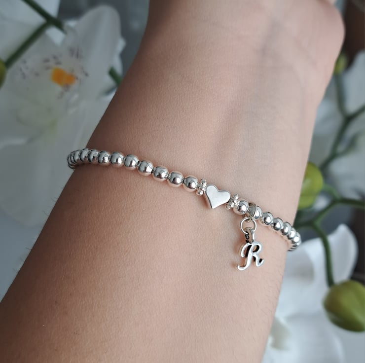 A beautiful personalised silver beaded bracelet, handmade with an initial charm and heart charm for a simple and meaningful finish. This stretchy bracelet makes a lovely gift for birthdays, special occasions or as an everyday keepsake.