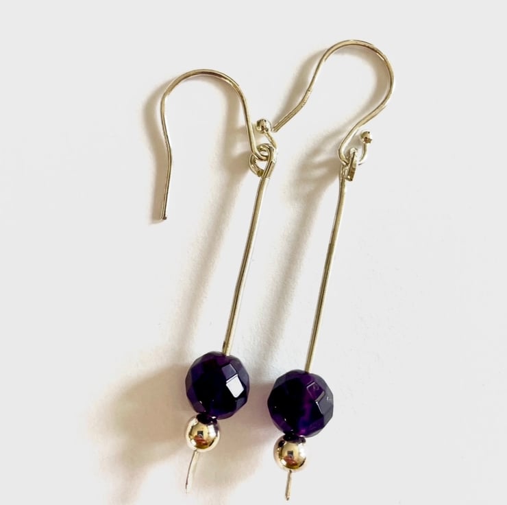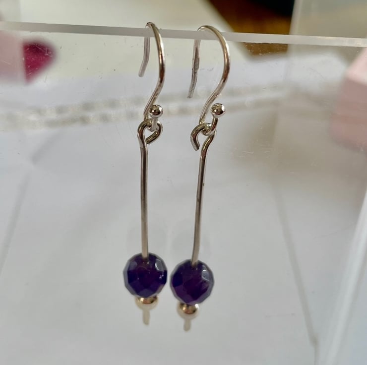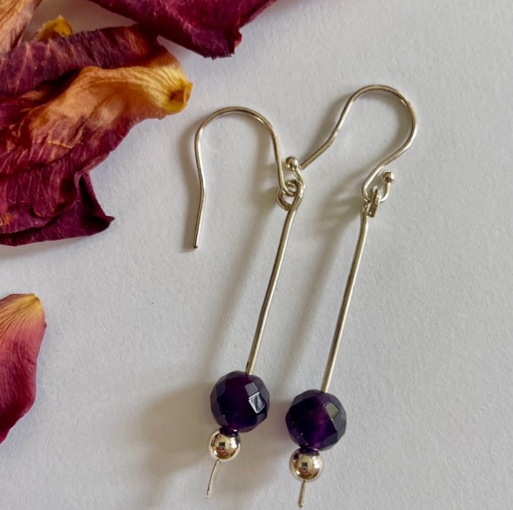Designed by me, these sterling silver matchstick earrings feature a faceted amethyst and a silver ball. They measure 3 1/2 cm long and are completely unique.