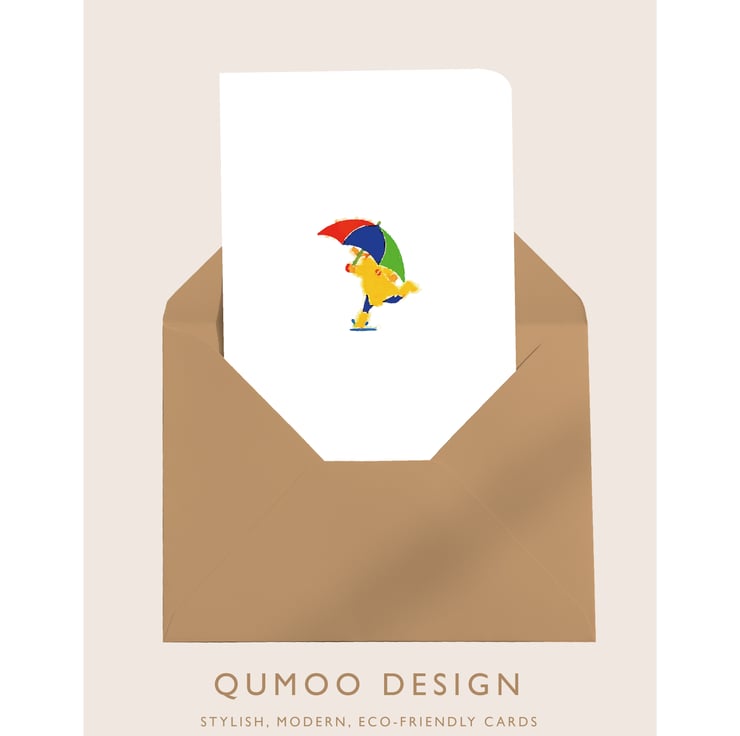 Splashing in puddles yellow mac Card: Spread joy and celebrate with this stylish, blank individual A6 card with a youngster splashing in puddles - perfect as a birthday or celebration card. The card displays a minimalist illustration in a watercolour style of a child in yellow rain gear leaping through a puddle while holding a multi-coloured umbrella.