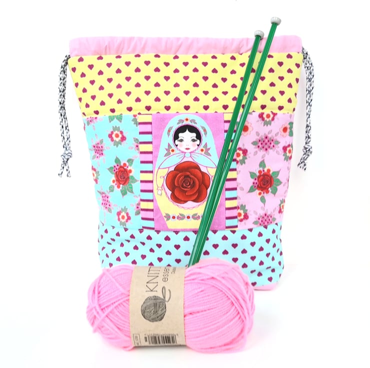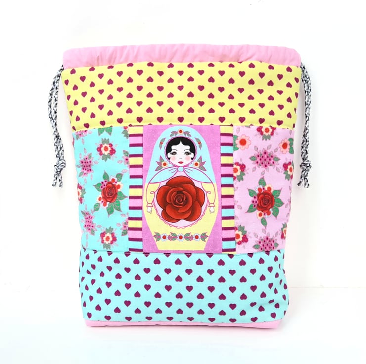 This is a lovely colourful medium size drawstring project bag with our Matryoshka Doll illustration on the front as part of a patchwork design. It would make a cute and useful gift for a knitter/ crocheter/ needleworker / crafter or treat for yourself.