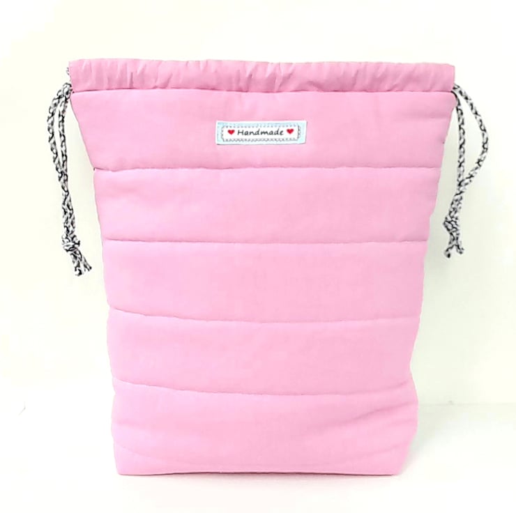 Both front and back are padded and quilted so a good sturdy fully lined drawstring bag. All fabrics used are 100% cotton. Spot clean is recommended.