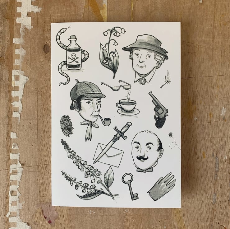 Illustrated card featuring some of my favourite fictional detectives, and various murder plot devices!