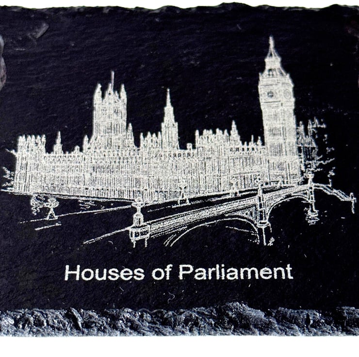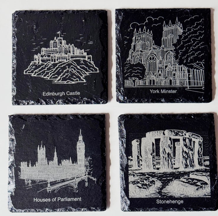 Bring a piece of Britain into your home with this beautifully crafted set of 4 natural slate coasters, each engraved with a famous UK landmark. Featuring Edinburgh Castle, York Minster, Houses of Parliament, and Stonehenge, this set captures some of the most iconic sights across the United Kingdom.