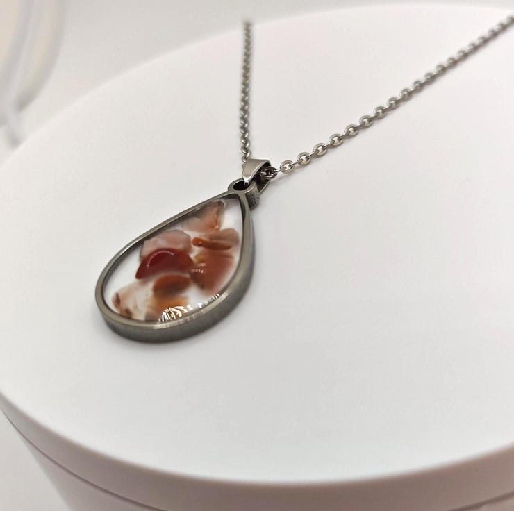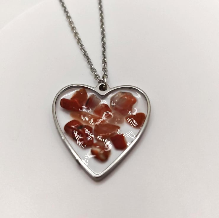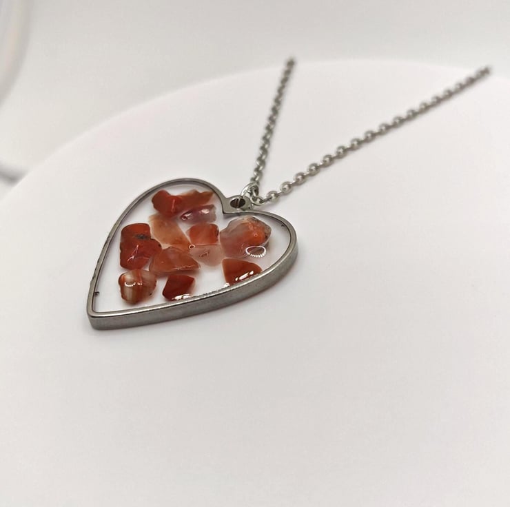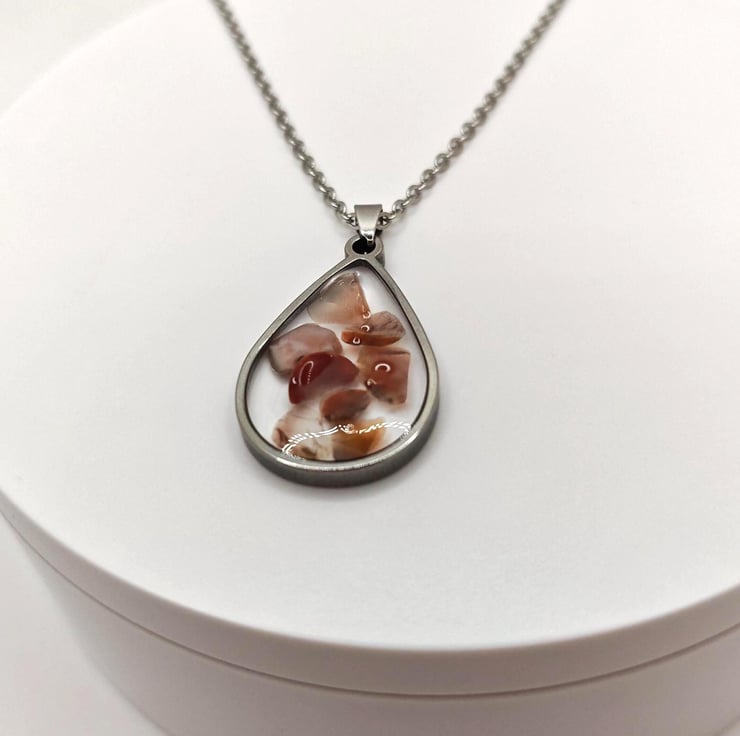 Choose your pendant shape: Heart or Teardrop, both filled with natural Red Agate chips that shimmer beautifully in the light.