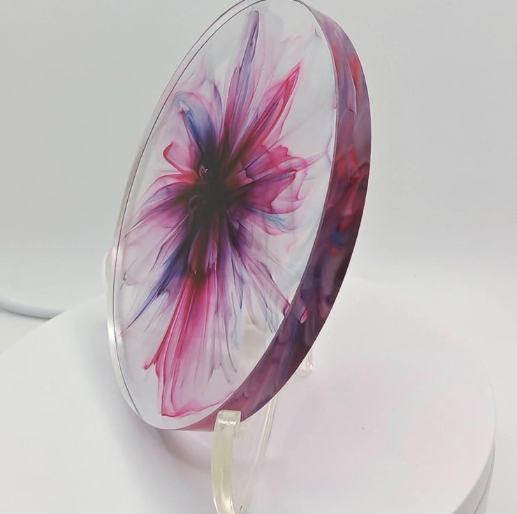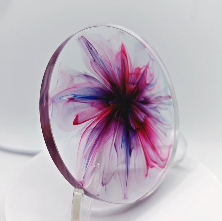 Handmade resin coaster with a pink and purple blooming colour effect.