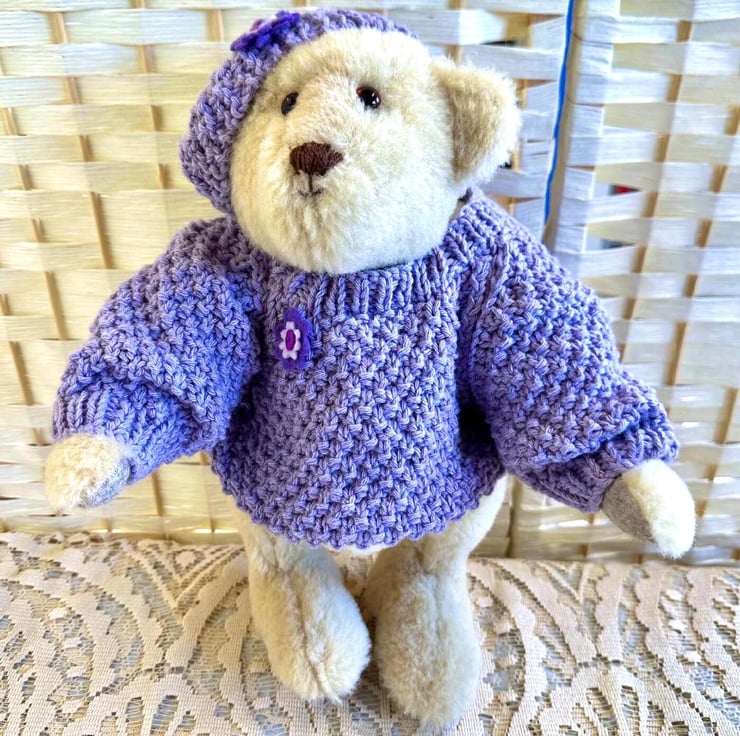 She’s wearing a hand knitted Purple jumper and headband, decorated with felt flowers.