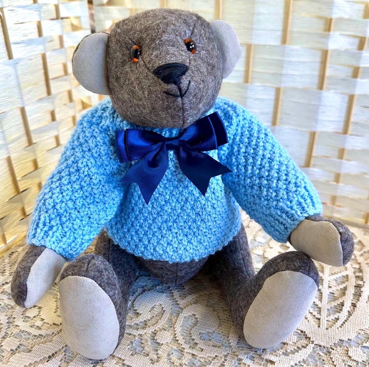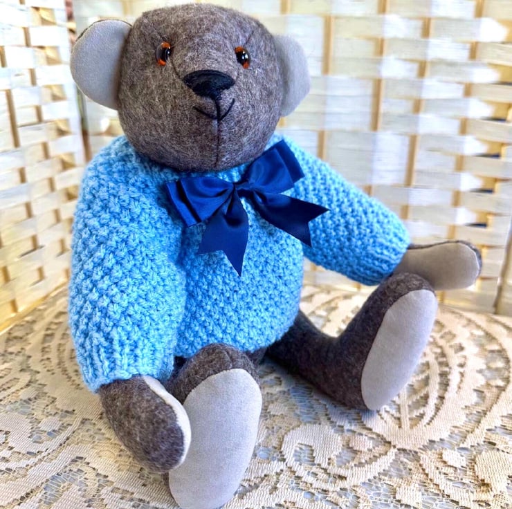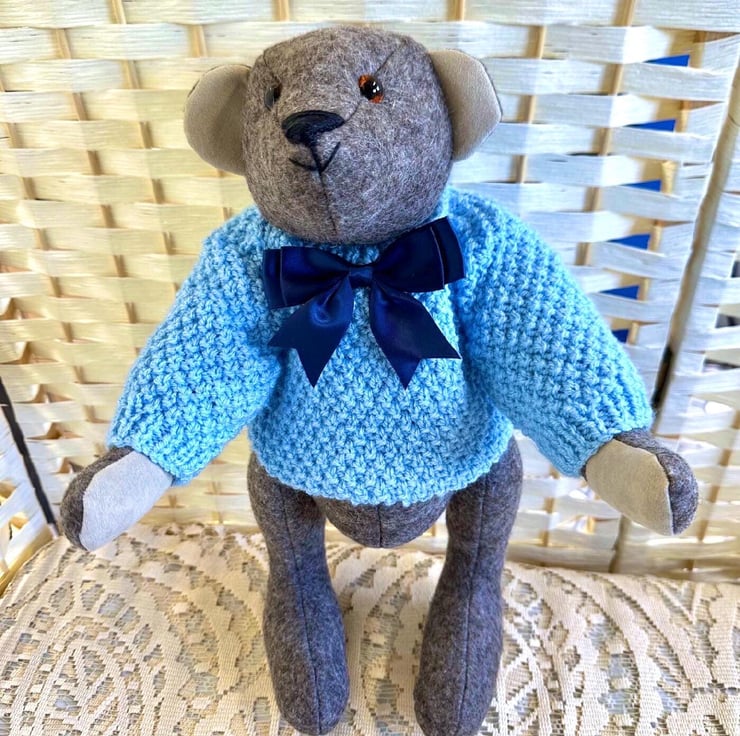He’s wearing a hand knitted Blue jumper, decorated with a Blue bow.