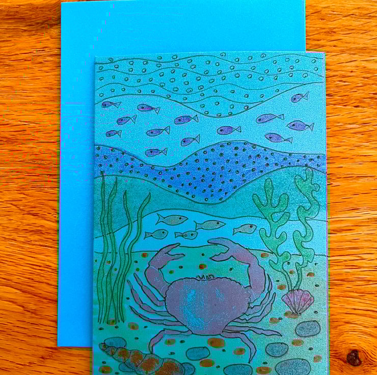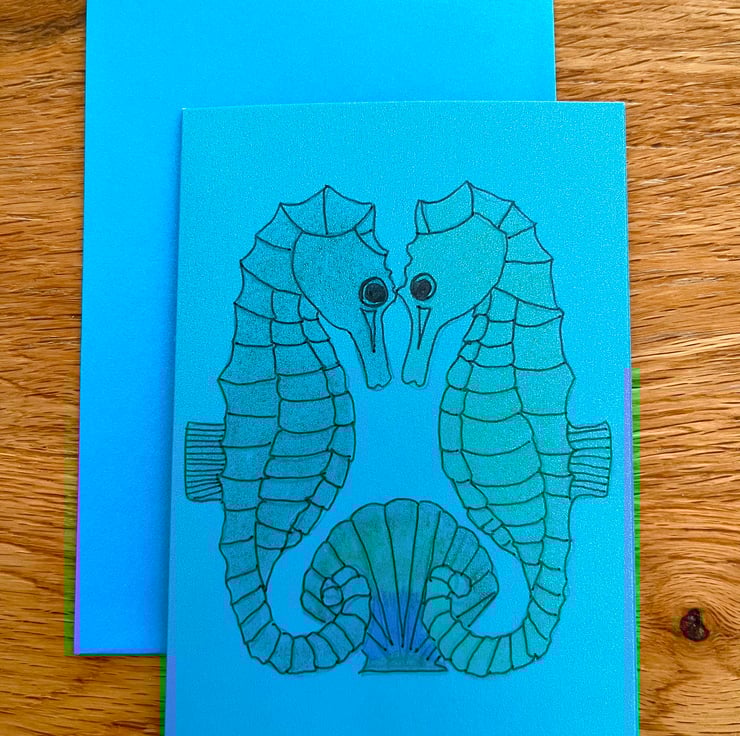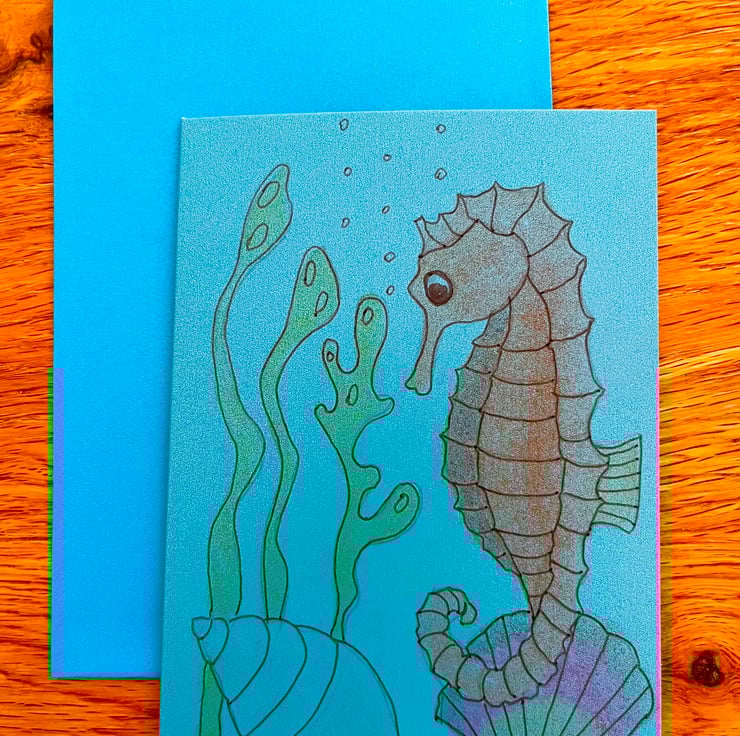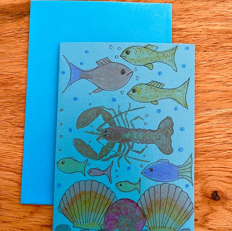 A set of four hand painted greeting cards featuring seahorses, shells ,lobster and crab .