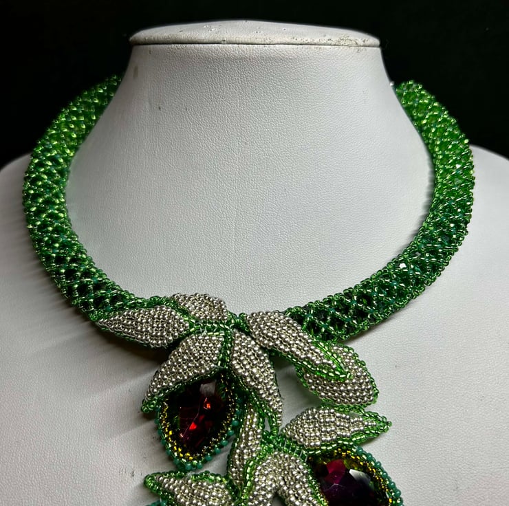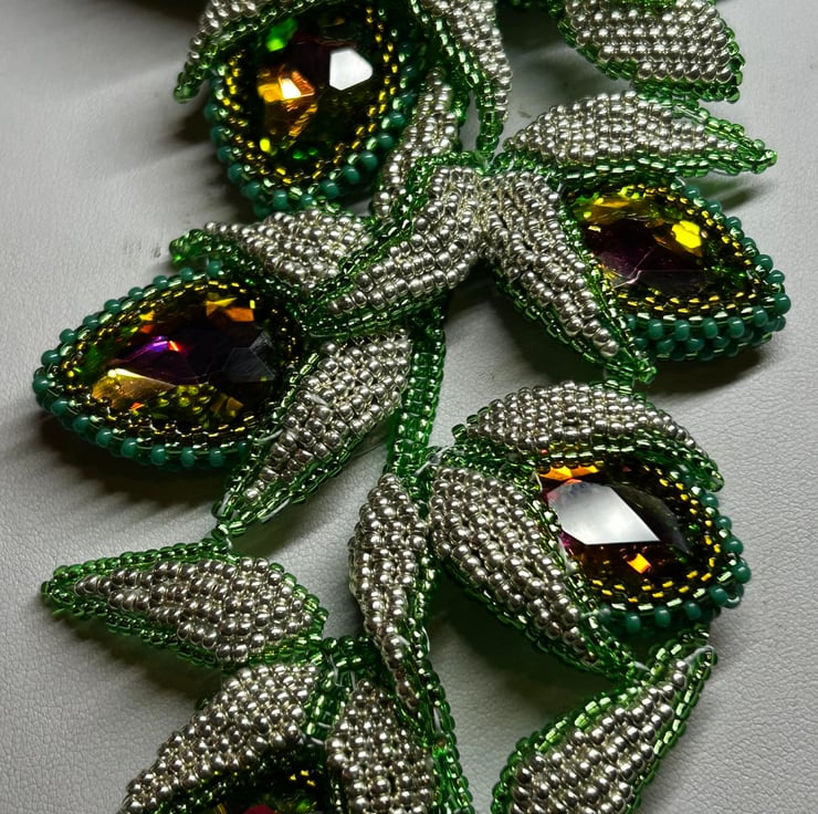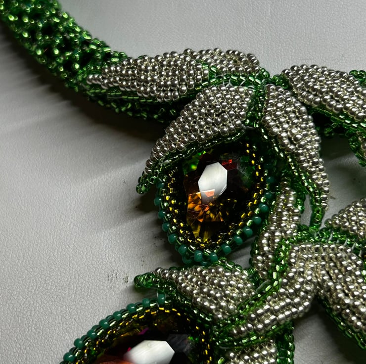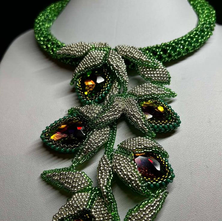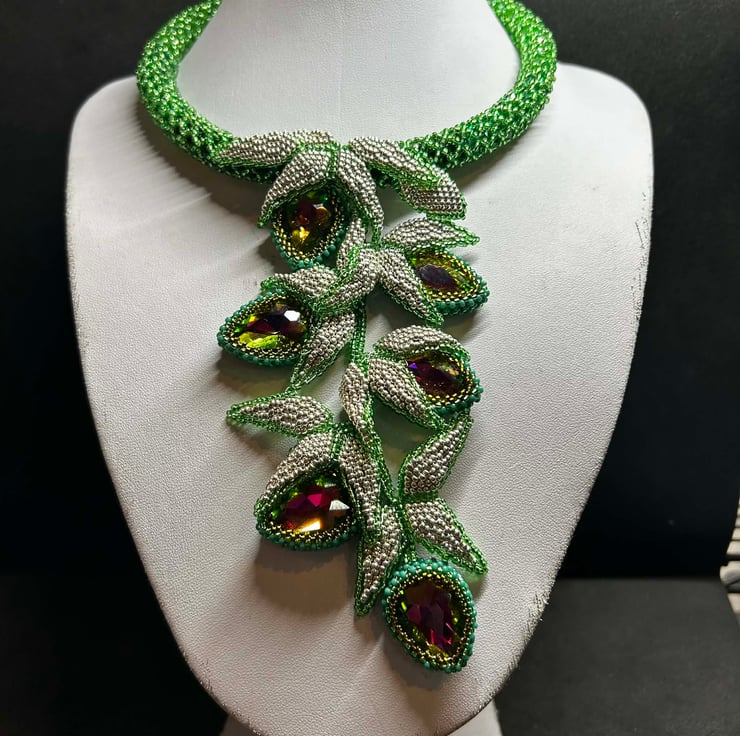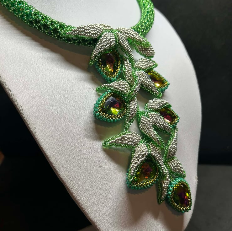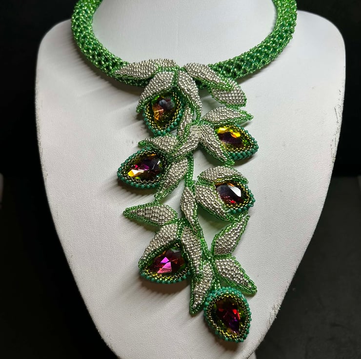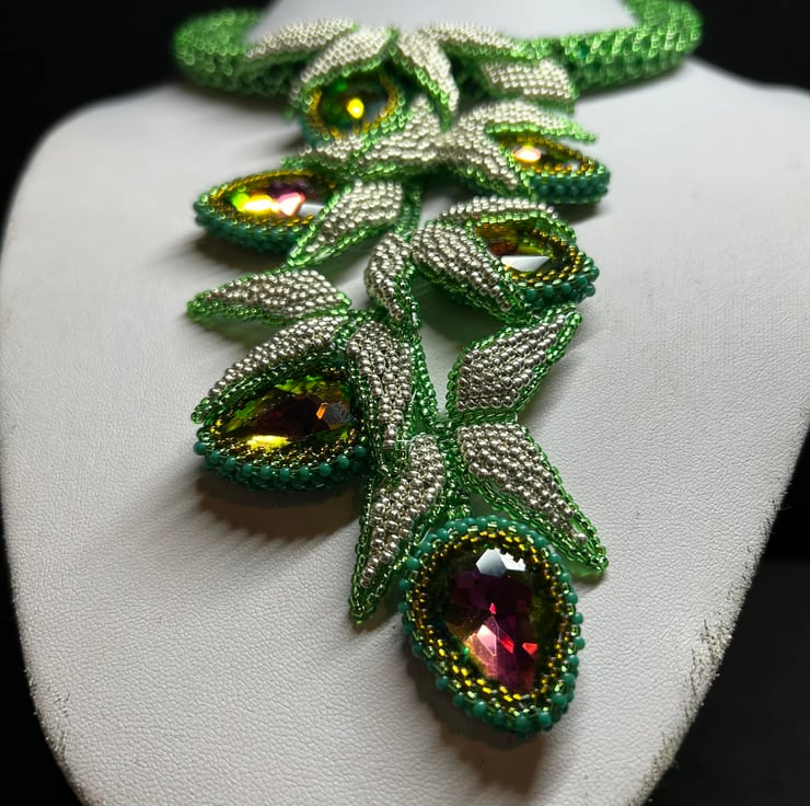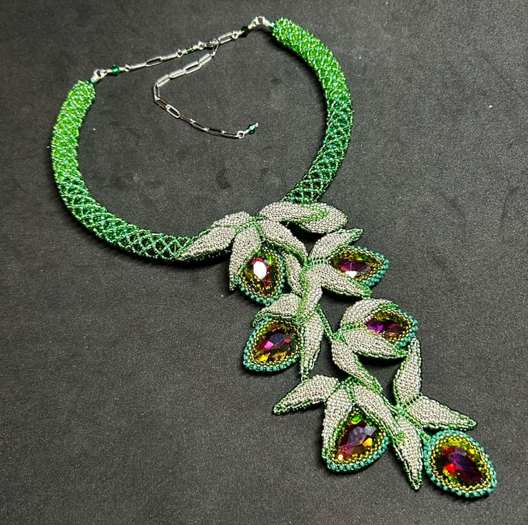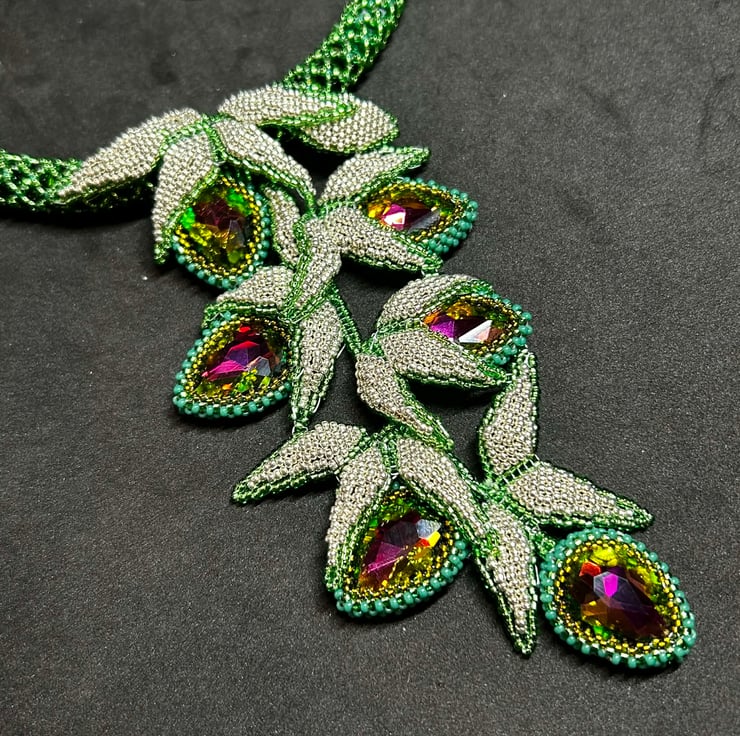 This unique piece is full of drama and uses Miyuki glass seed beads, an array of green crystals and some fabulous colour-change watermelon crystal pears in a dazzling hand-made necklace.