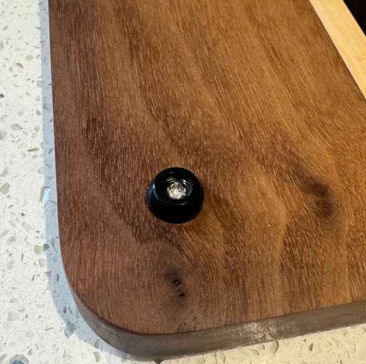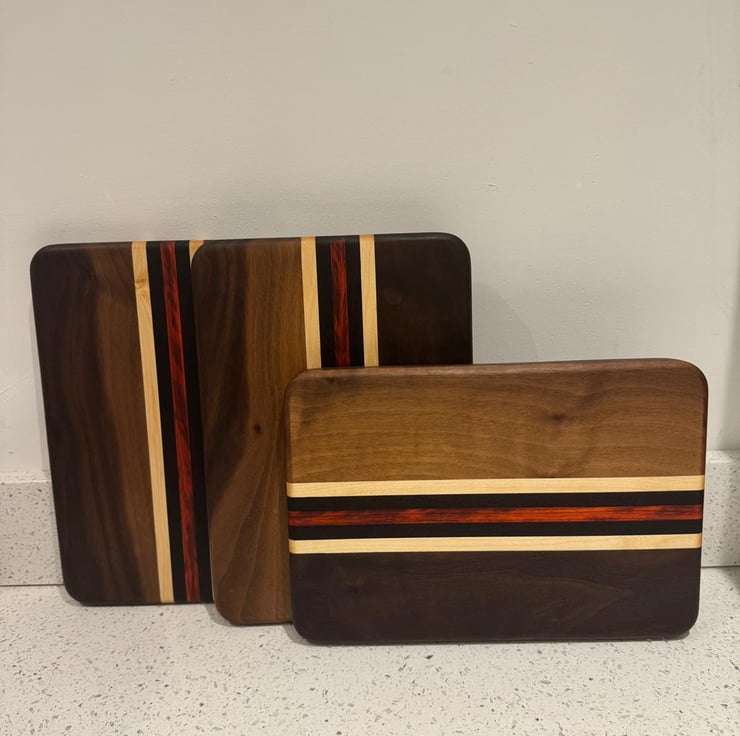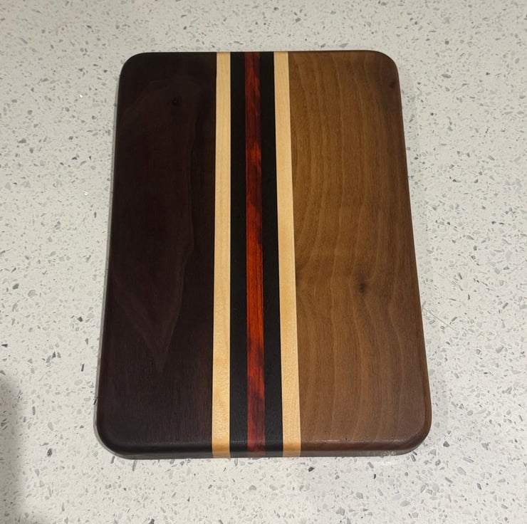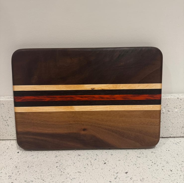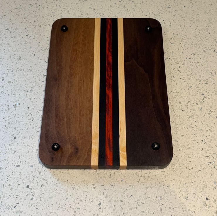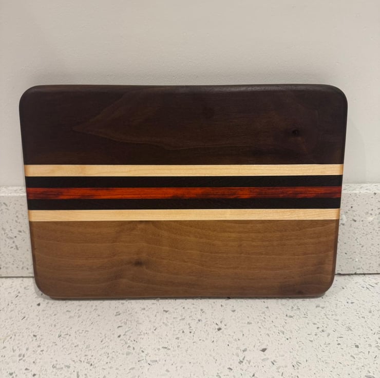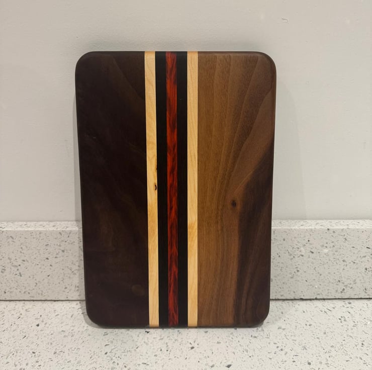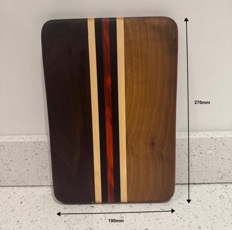 Handcrafted serving board featuring a striking combination of walnut, maple, wenge and padauk woods. Approximately 23mm thick for durability and presence on the table. Fitted with rubber feet underneath to protect surfaces and prevent slipping during use. Perfect for presenting charcuterie, cheese, bread or appetisers with natural elegance. Each board showcases the unique grain and colour variations of these premium timbers, making every piece distinctive. A functional addition to any kitchen or dining experience.