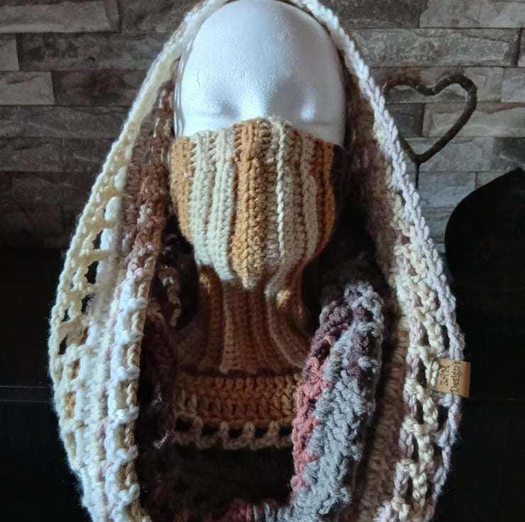 Handmade crocheted hooded shawl with multiple ways to wear.