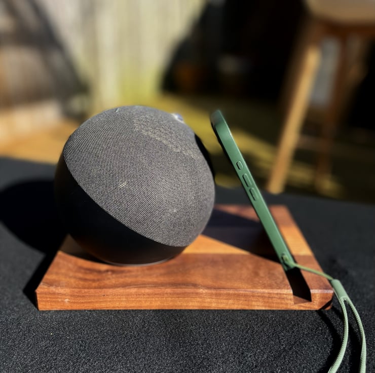 A circular recess is shaped to support the spherical Amazon Echo and lift it slightly above the surface. The front slot allows the stand to also hold a phone, so it remains useful even when the speaker is not in place.