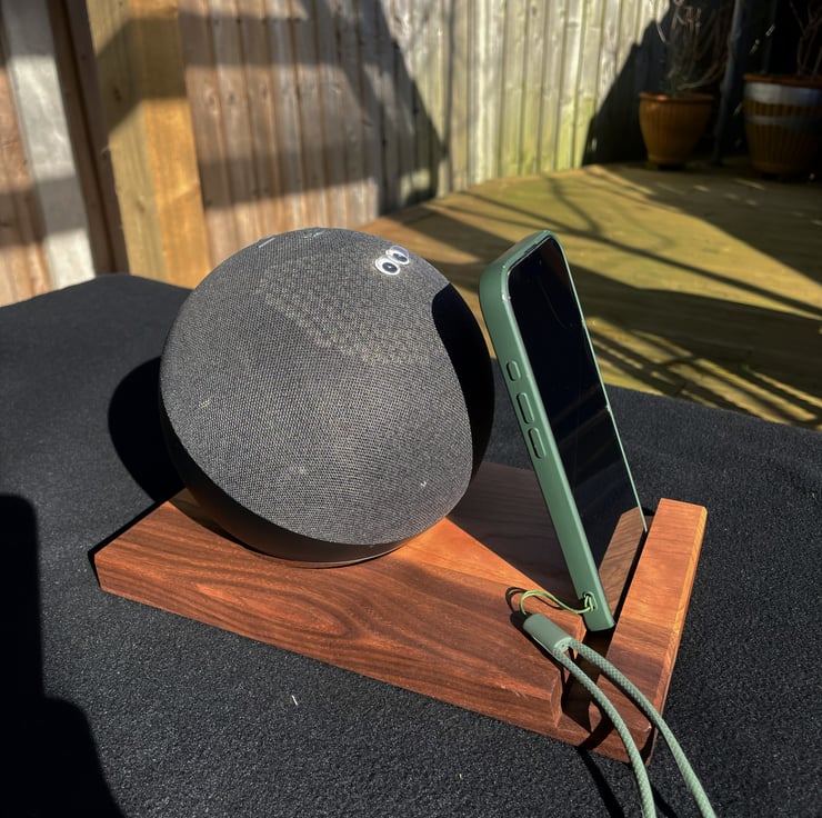 A circular recess is shaped to hold the spherical Amazon Echo securely while lifting it slightly above the surface. This creates a cleaner and more intentional setup on a desk, shelf or kitchen counter. The front slot allows the stand to also hold a phone, so it remains useful even when the speaker is not in place.