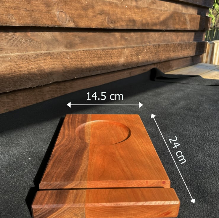 The stand is made from 20 mm thick solid hardwood, giving it a stable weight and a secure presence on the surface. The surfaces are carefully sanded and finished with Danish oil to enhance the natural grain and maintain a warm matte character.