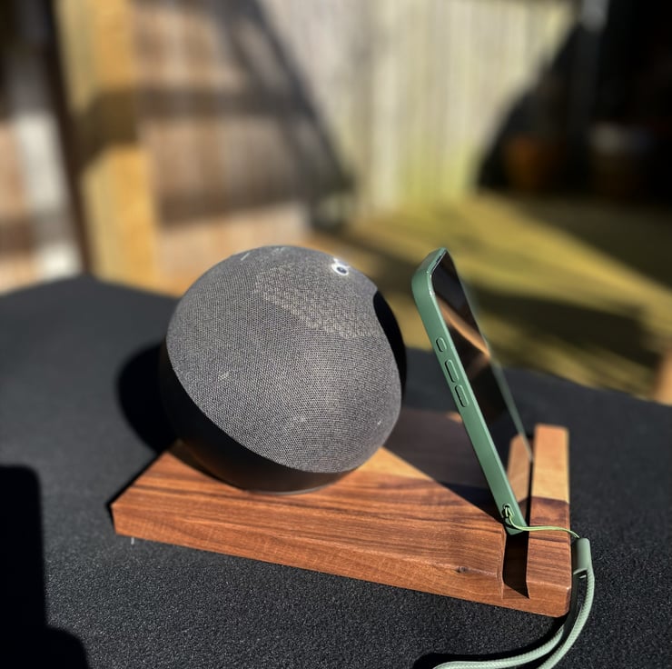 A circular recess is shaped to support the spherical Amazon Echo and raise it slightly above the surface. This subtle elevation helps create a more intentional and tidy setup. The front slot allows the stand to also hold a phone when the speaker is not in use.