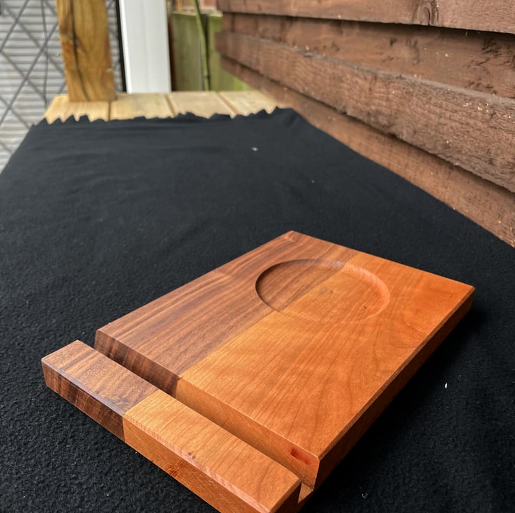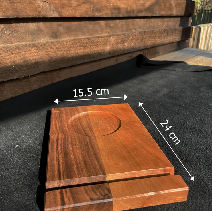 The stand is made from 20 mm thick solid hardwood, giving it a stable weight and a confident presence on the surface. The surfaces are carefully sanded and finished with Danish oil to enhance the natural grain and maintain a warm matte character.
