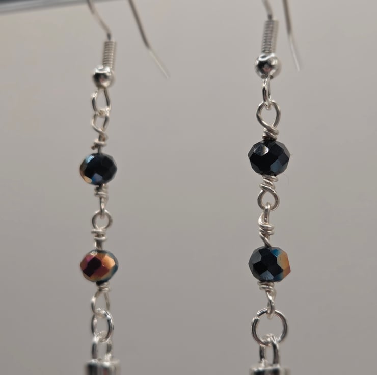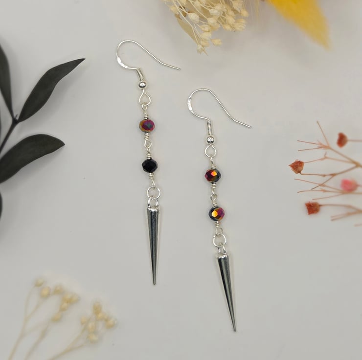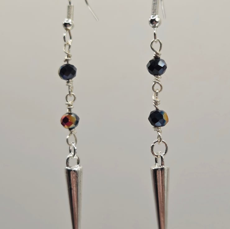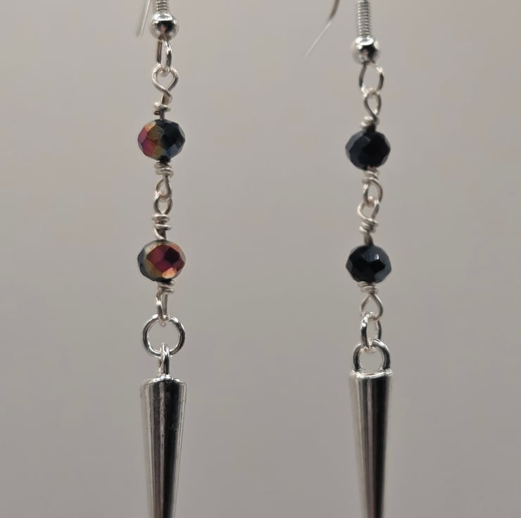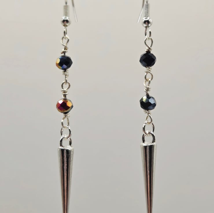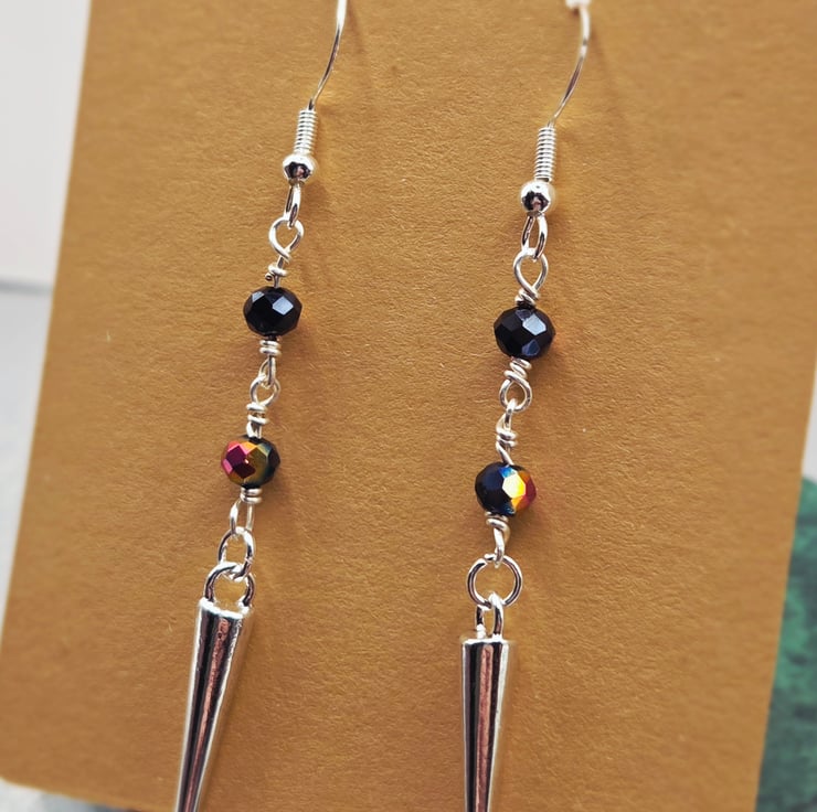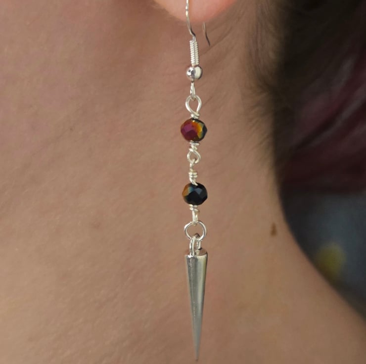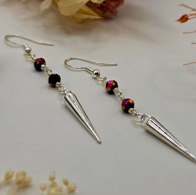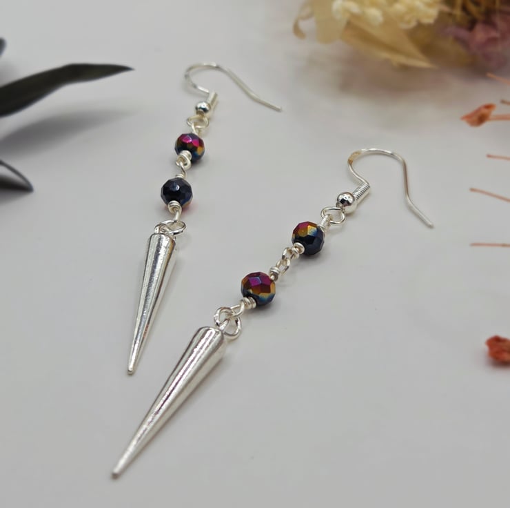 Handmade dangle/drop earrings with sterling silver hooks and featuring sparkly faceted black/rainbow beads and silver spike charms.