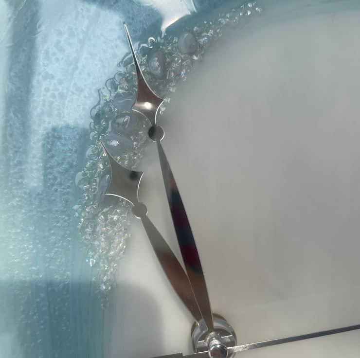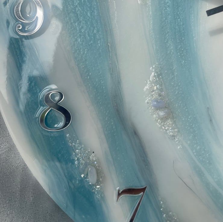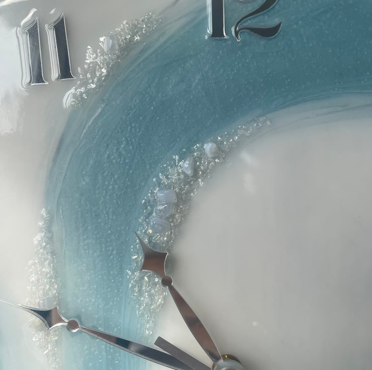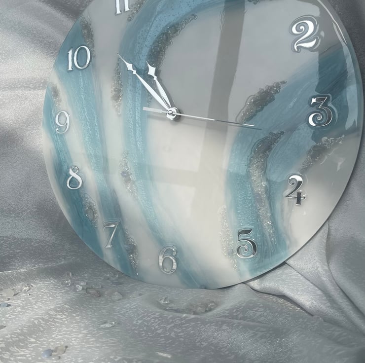 This handmade resin clock is designed with baby blue, white color and decorated with some blue and white crystal.