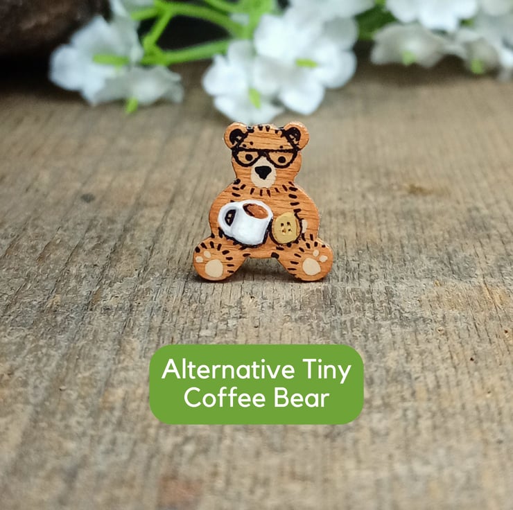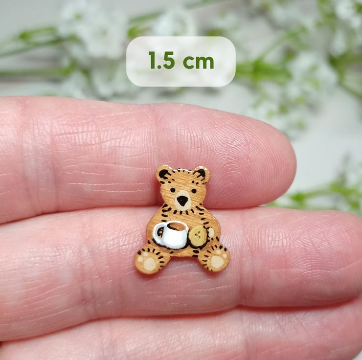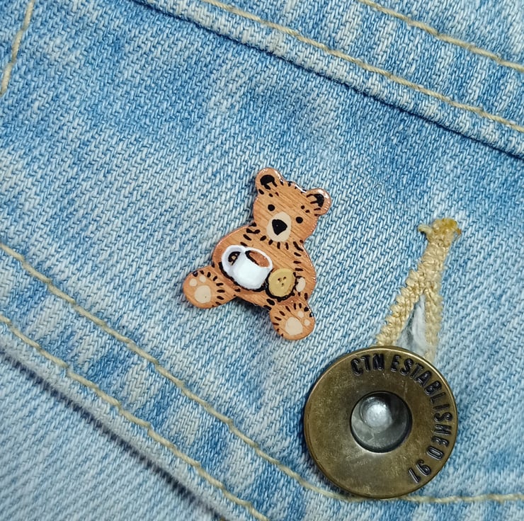 Handmade Tiny Coffee Teddy Bear Pin, Wooden Bear Badge, Coffee Lover Gift, Cute Collectable
