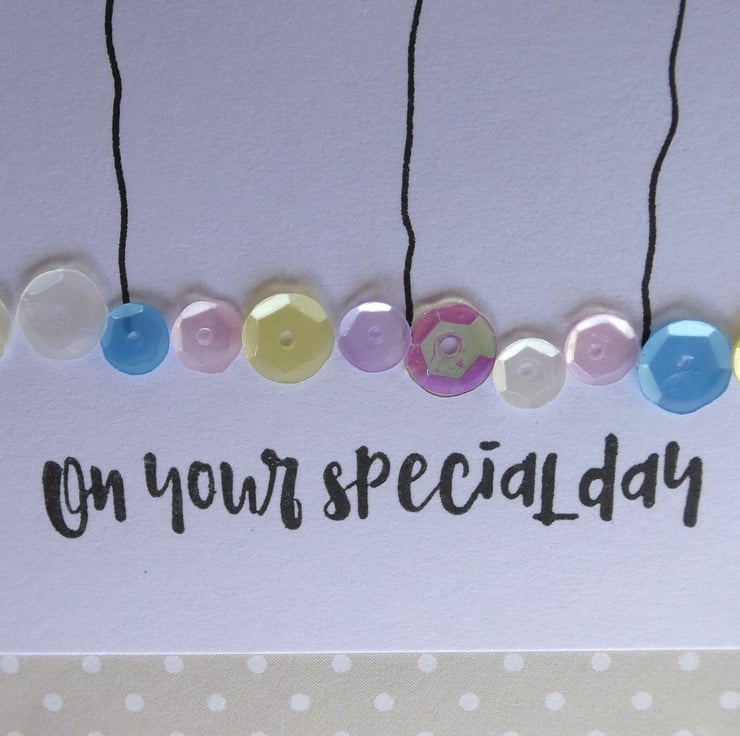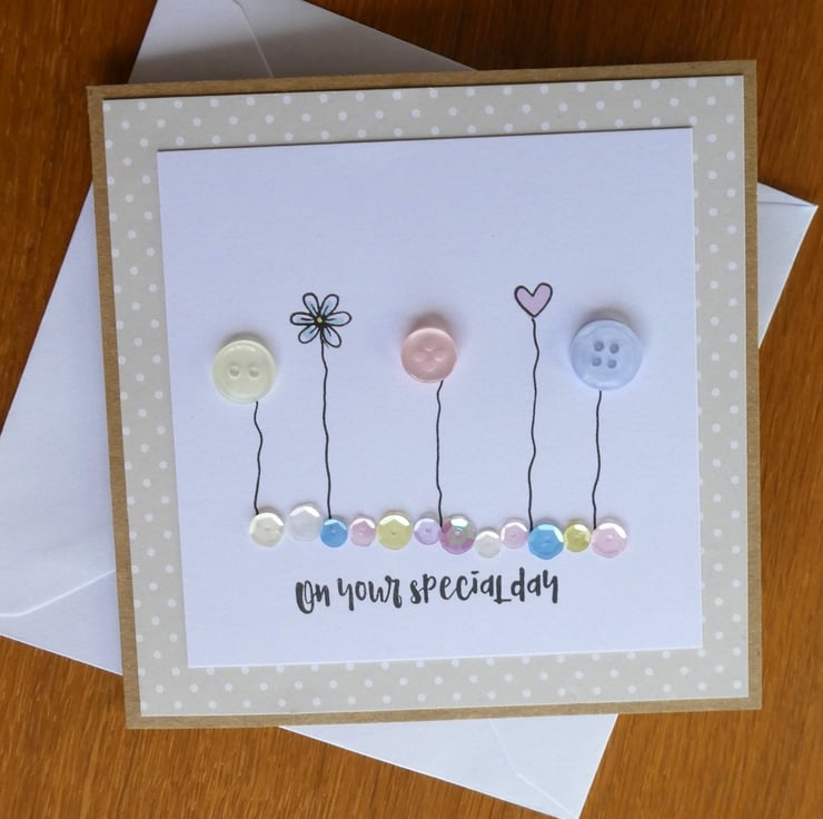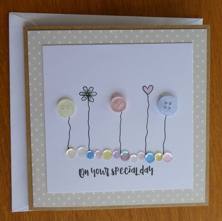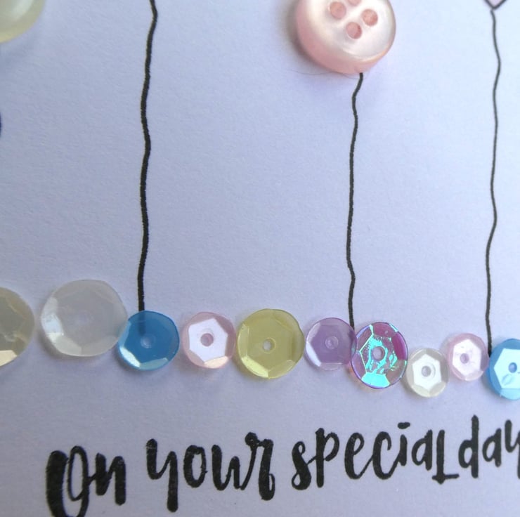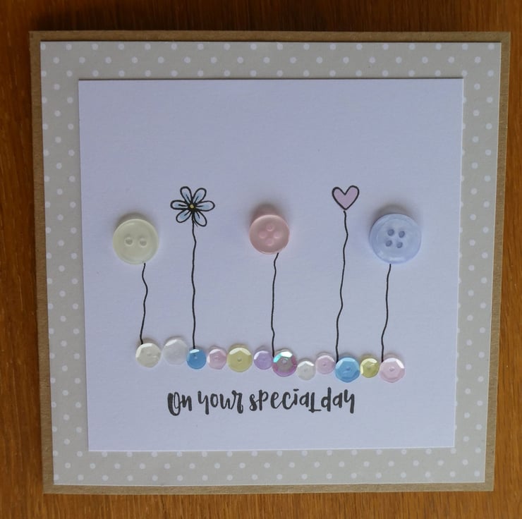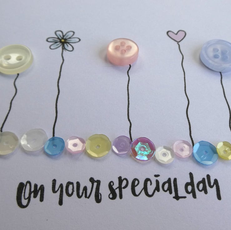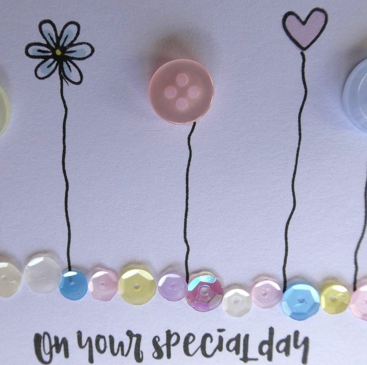 This pretty card has a row of buttons and hand stamped daisies and hearts, sitting above a line of sequins in shades of pink, blue, lemon and white and the message On Your Special Day. It would be ideal to send as a Birthday card, anniversary card or to celebrate any special occasion.