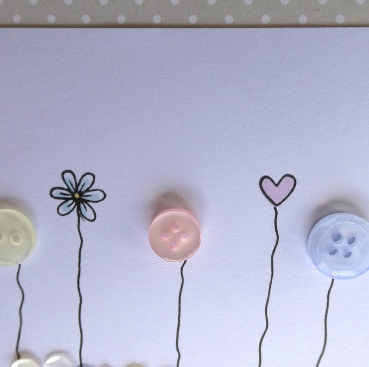 Three buttons, one pale lemon, one peach and one pale blue are mixed with a daisy and a pastel pink heart which have been hand stamped and inked. They have all been finished with hand drawn stems to connect them to a row of sequins in shades of pink, blue, lemon and white.