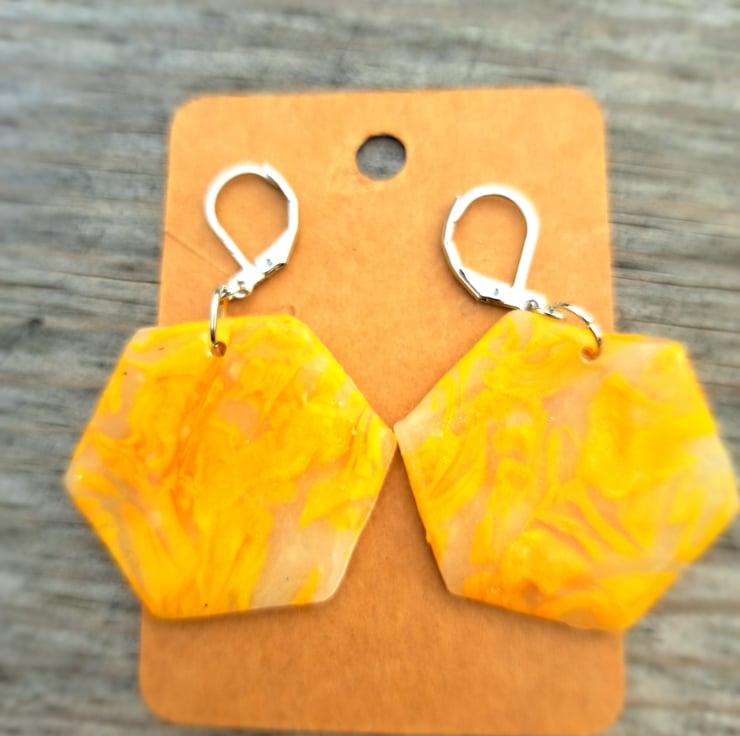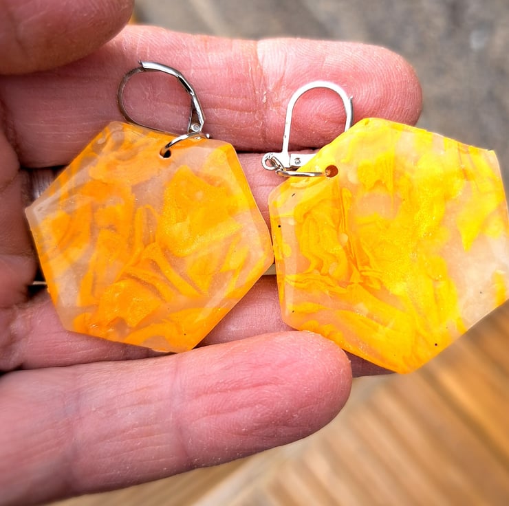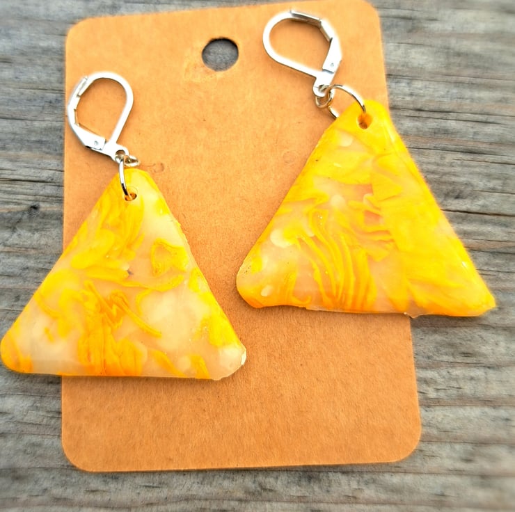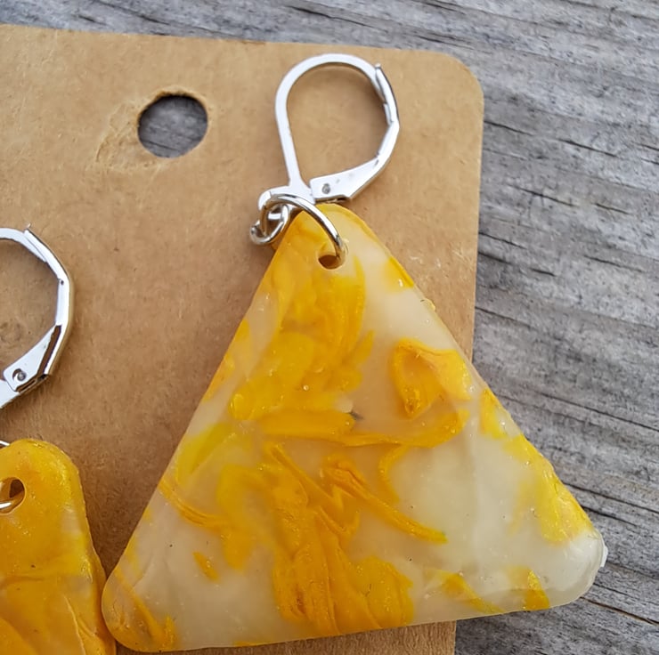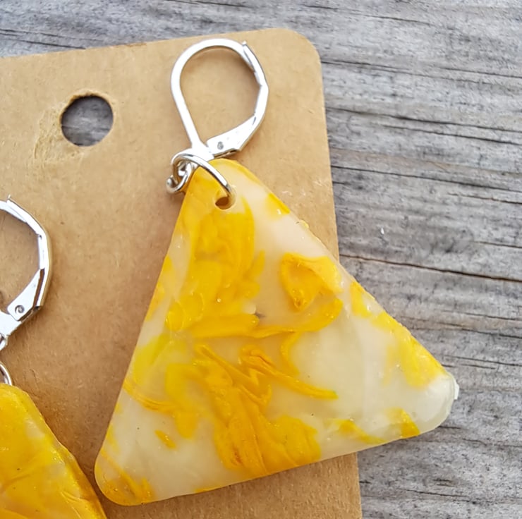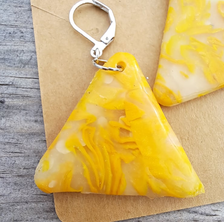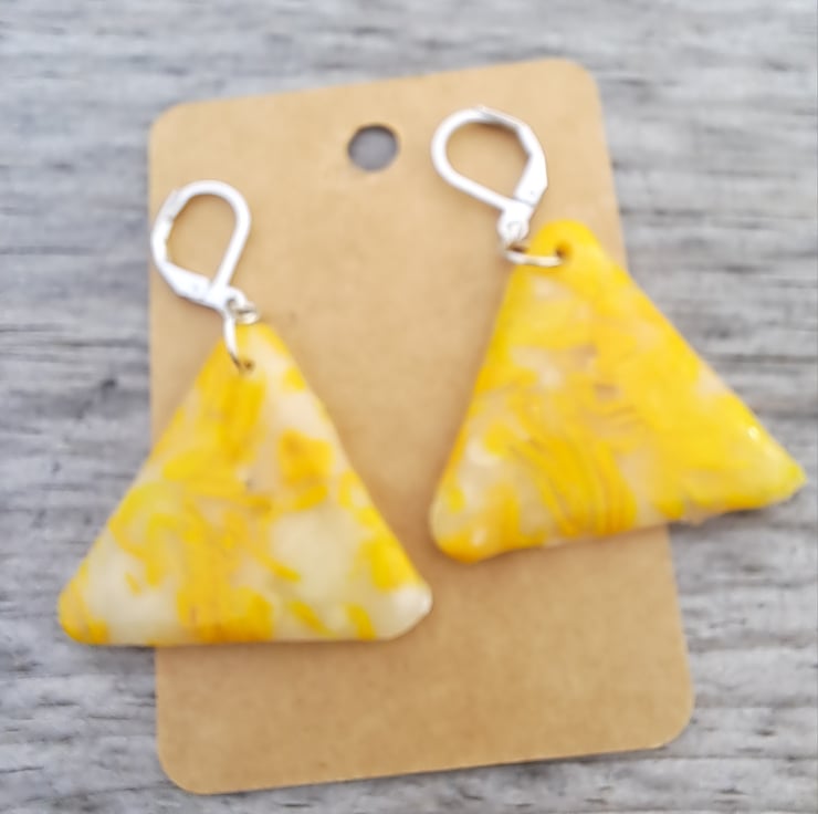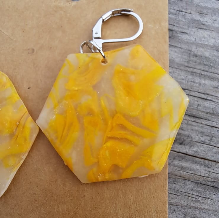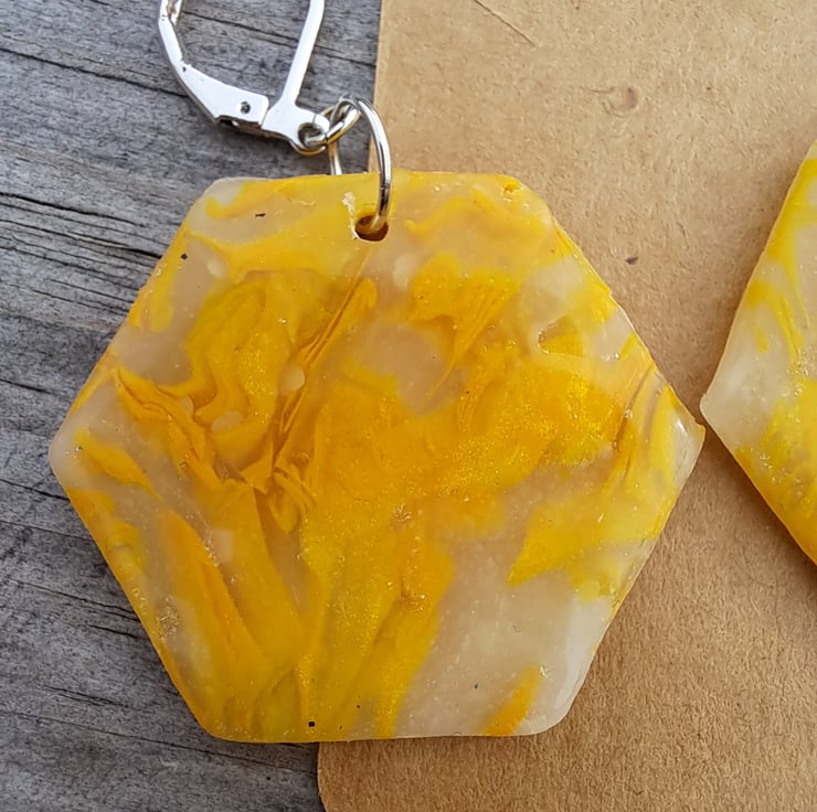I have used a selection of lemon and white polymer clay mixed with translucent, which gives these an interesting pattern. Finished with a coat of resin.