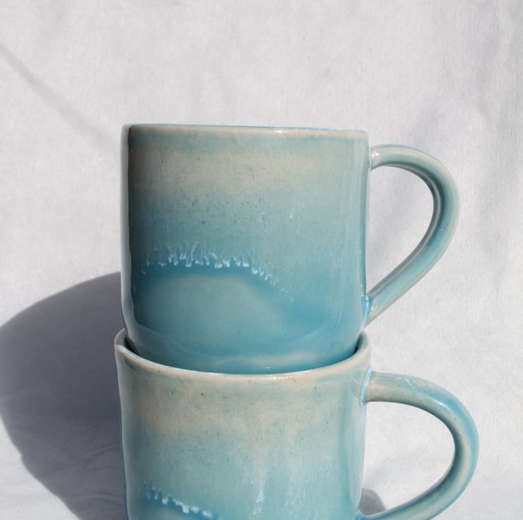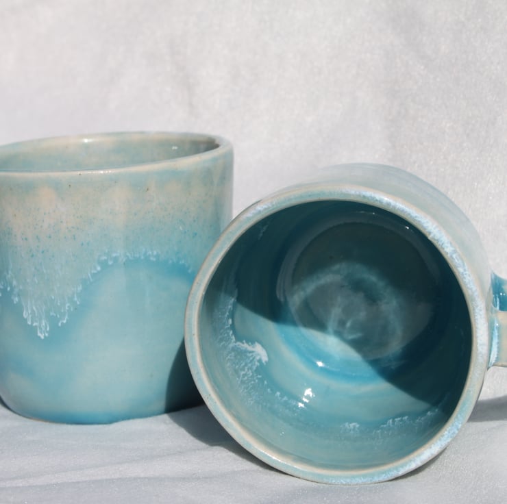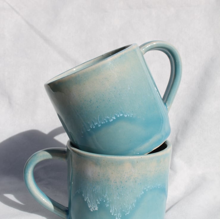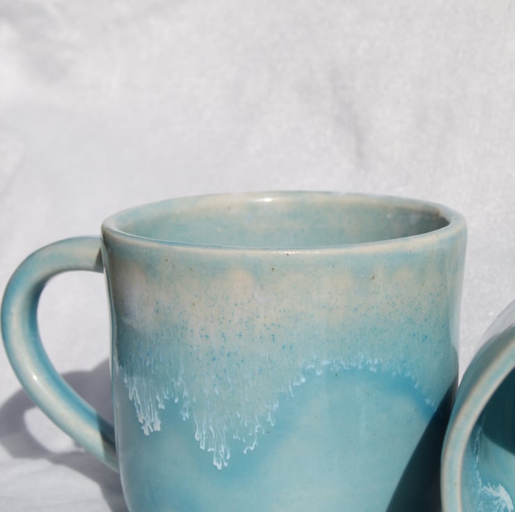 Wheel thrown mug glazed in a ocean turquoise colour with a white effect to illustrate a wave. The mugs are fired to c1200 degrees (stoneware temperature) which makes them durable and suitable for everyday use.