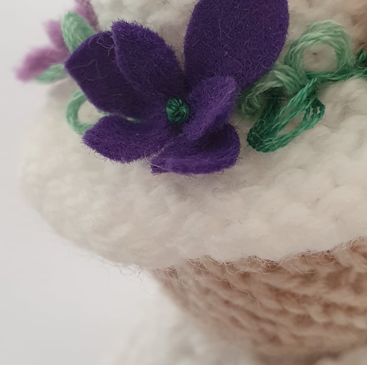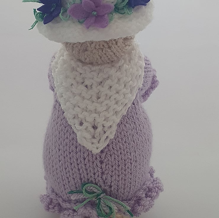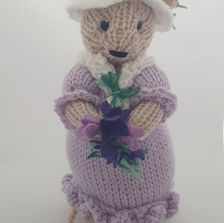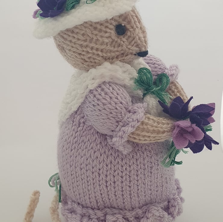 Violet is dressed in pale lilac and carries a posy of ot violet flowers. These sweet violets also decorate her white hat and she is warmly wrapped in a white shawl.