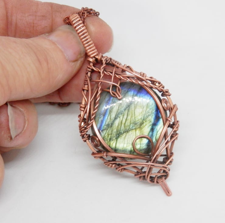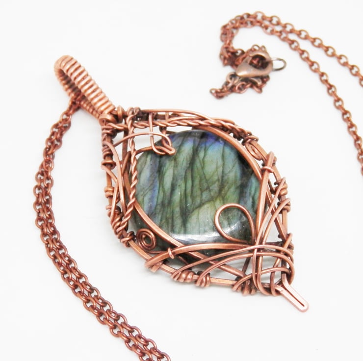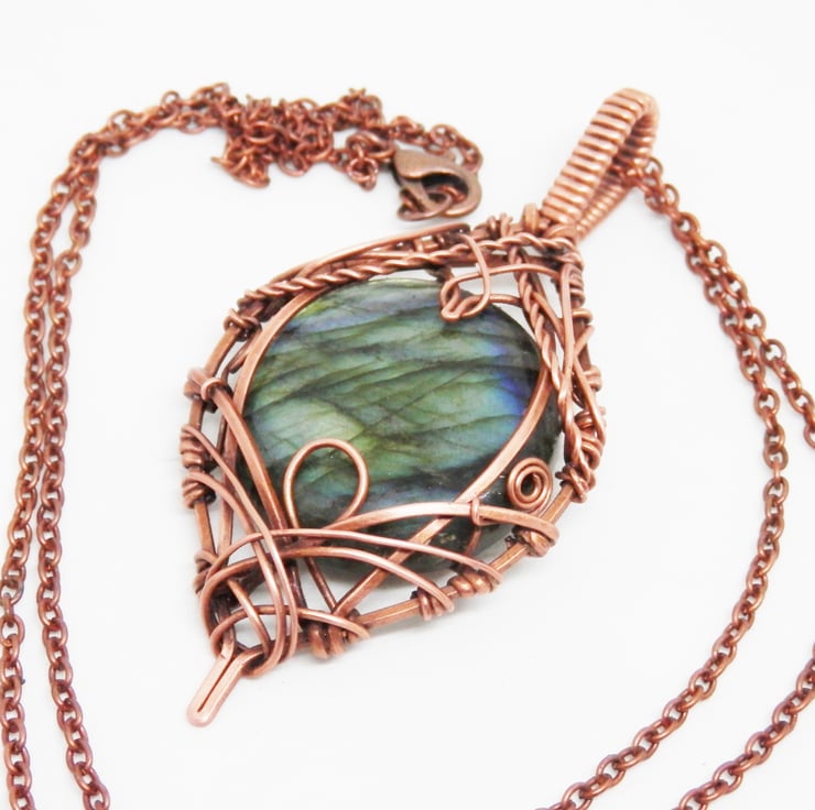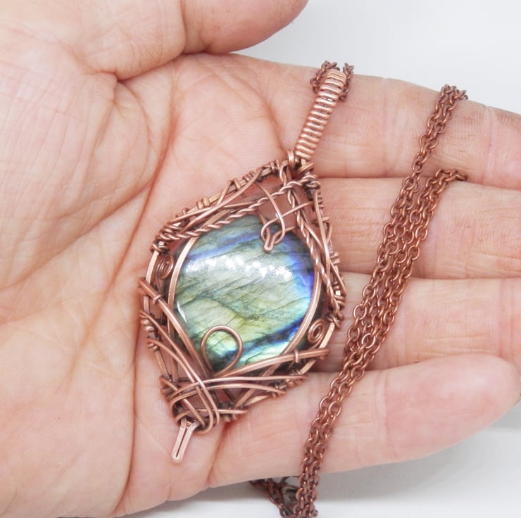 This is a stunning statement piece, made using copper wire that has been wrapped lovingly in an Elven style around a beautiful circular shaped piece of flashy Labradorite.