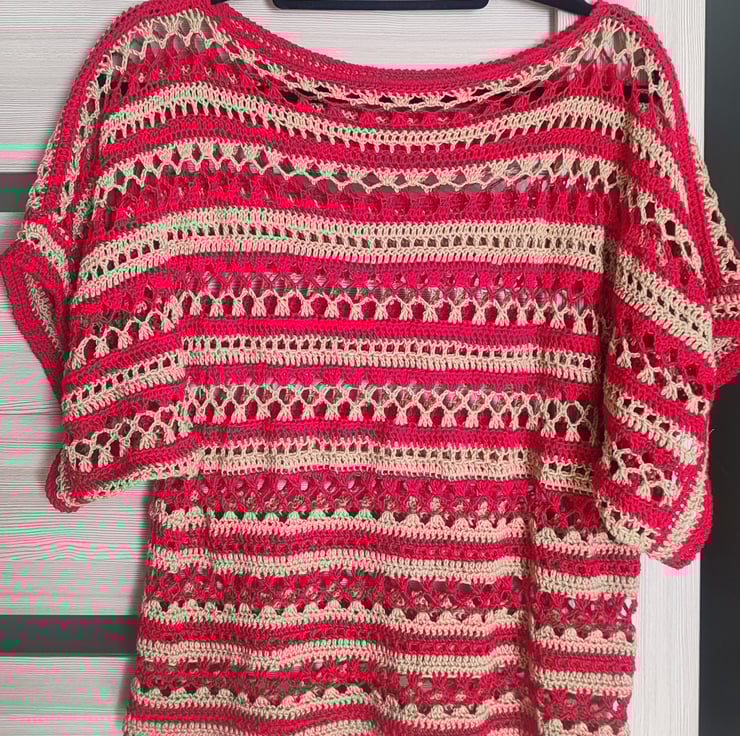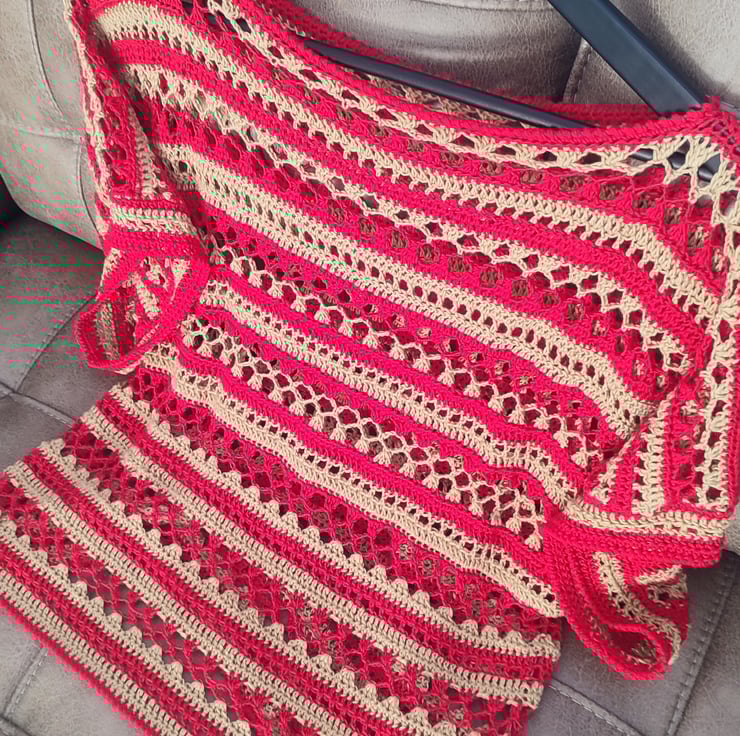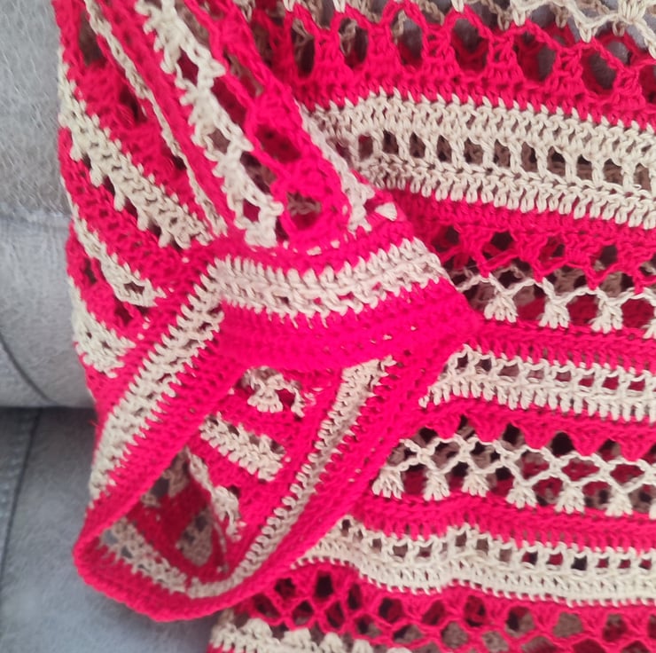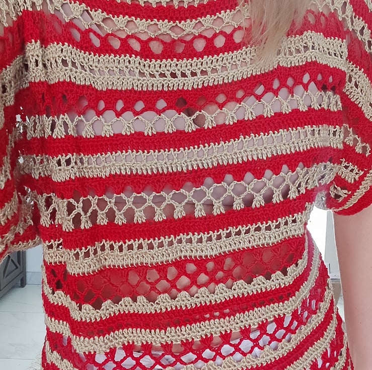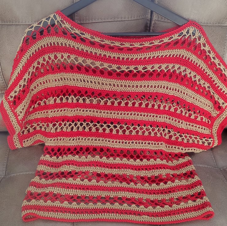 Handmade crochet beige/sand/red colour boat Neckline Women top ideal for spring/summer, for holidays.Openwork stitch pattern. The top made of 100% bamboo fiber yarn.