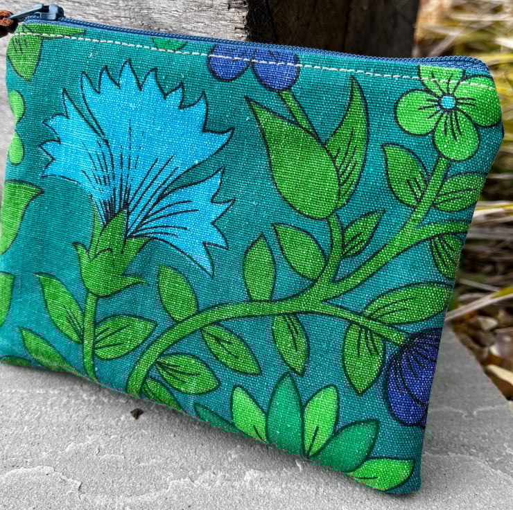 Bright reclaimed vintage floral coin purse or small zip pouch made from green and purple Roundelay cotton by Jonelle. The purse is backed with reclaimed denim and lined with plain green fabric from a sample swatch.