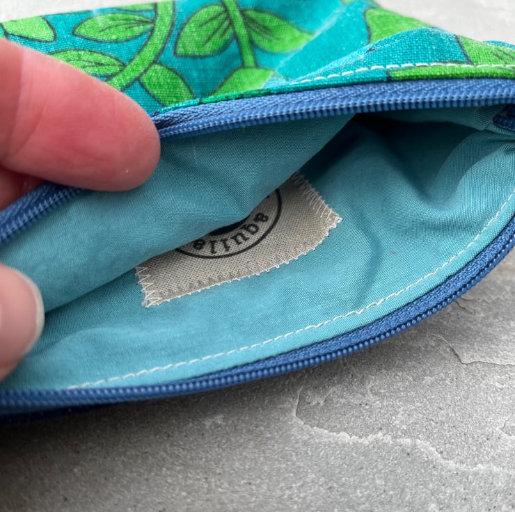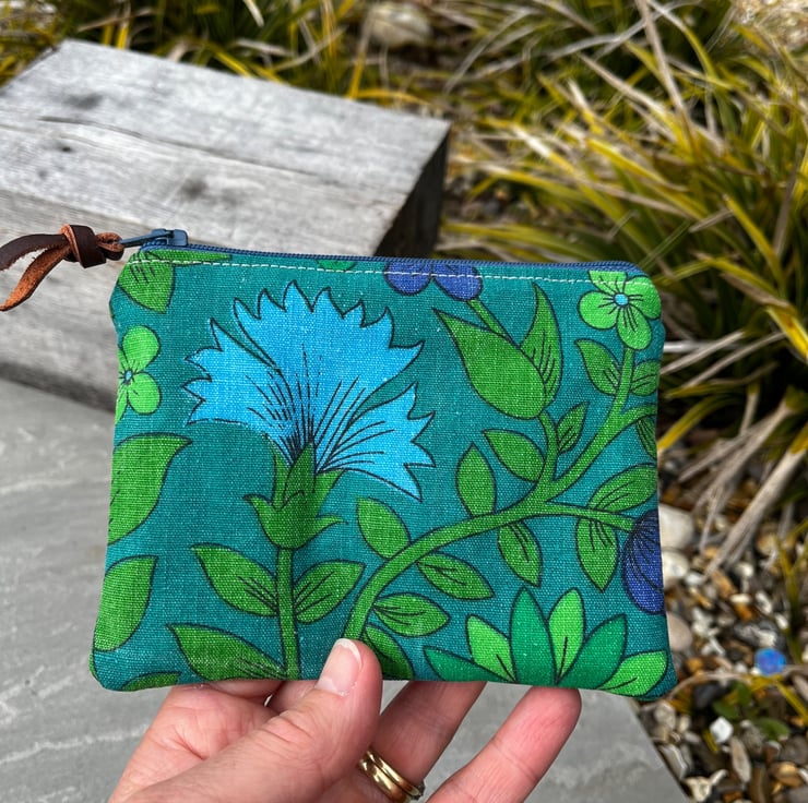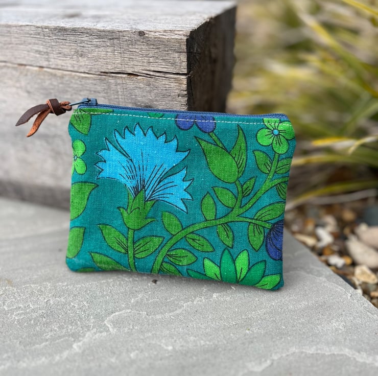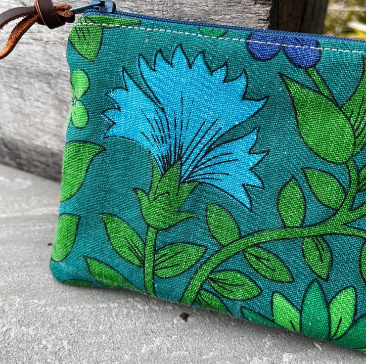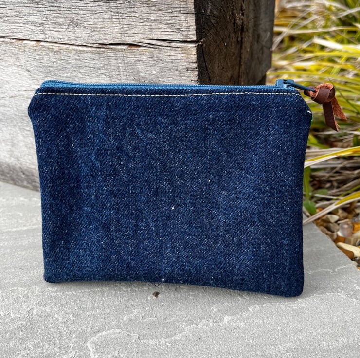 A strip of leather is tied to the zip pull. The leather was waste from an local upholsterer. This can be swapped for ribbon if preferred, just add a note at checkout.
