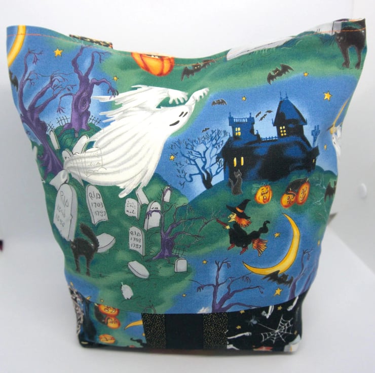 Handmade Halloween treat bag featuring a colourful haunted house scene with ghosts, pumpkins and a flying witch.