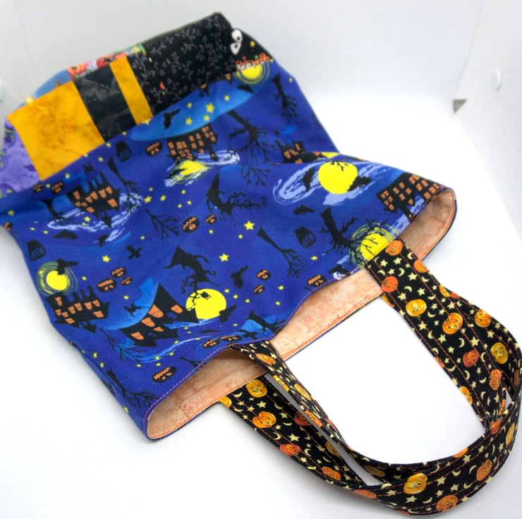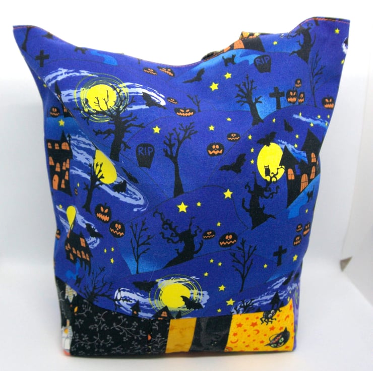 The design features a spooky landscape with pumpkins, bats, haunted houses and glowing moons on a deep blue background, finished with a patchwork-style base. Inside, the bag is lined with soft cotton for a practical and durable finish.
