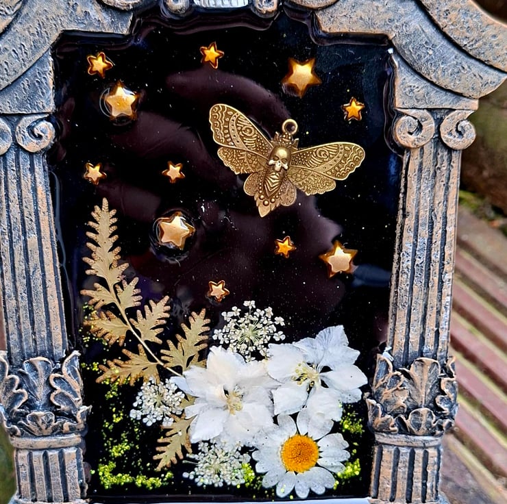 Handmade gothic art frame featuring real dried flowers, shimmering glitter, and a decorative charm, all preserved in crystal-clear resin.
