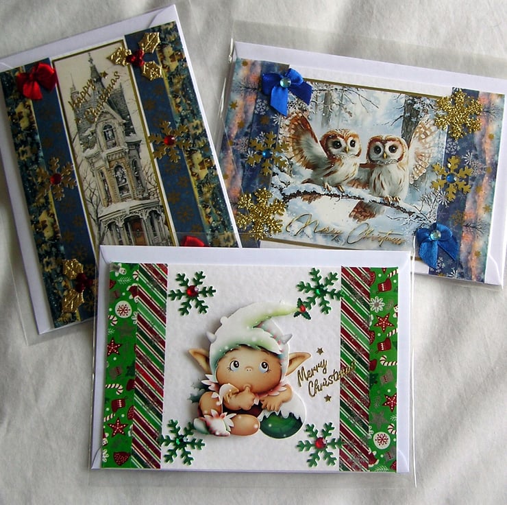 Set of 3 (Three) Beautiful Hand-Crafted Christmas Decoupage Greeting Cards (m)