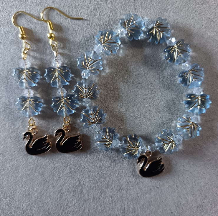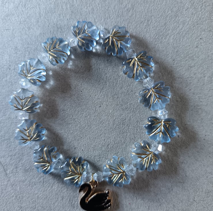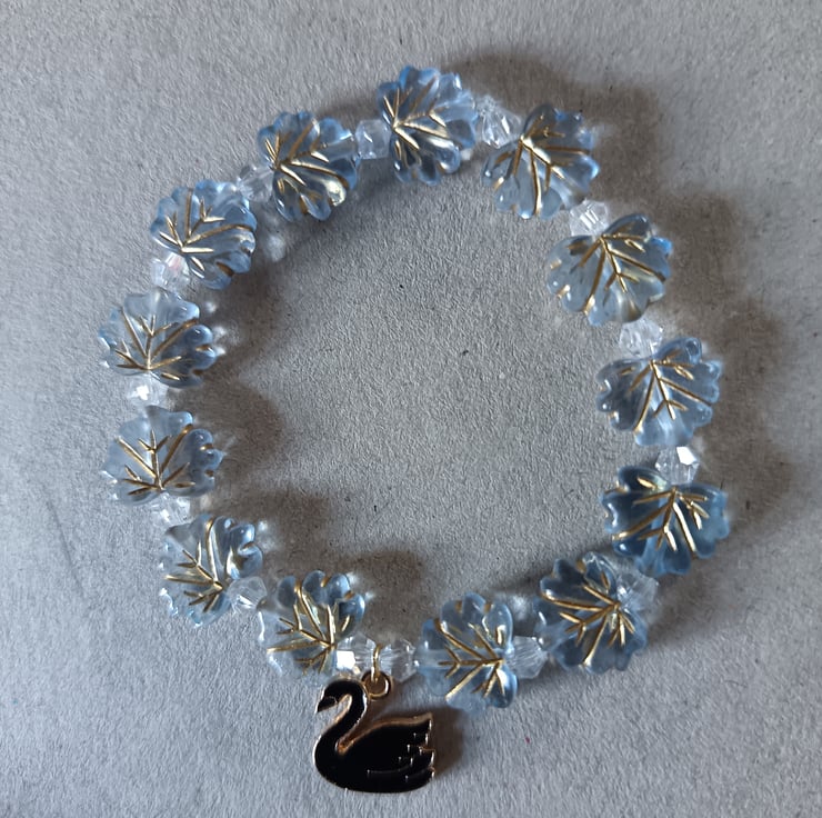 This handmade bracelet is crafted with magic stretch elastic, a gold and black enamel swan charm and features pale blue glass leaf beads and clear glass beads.