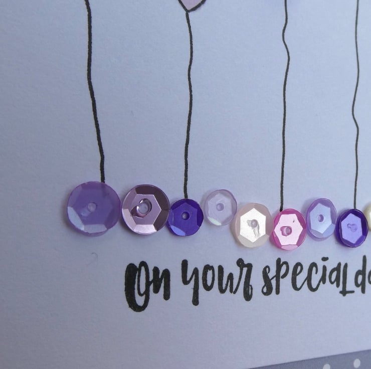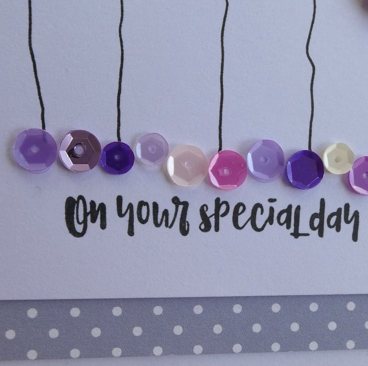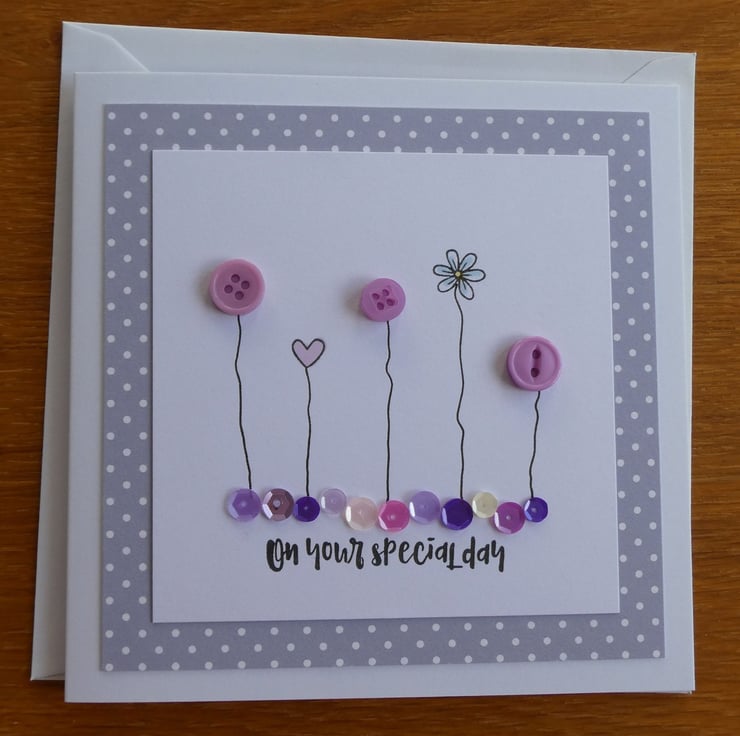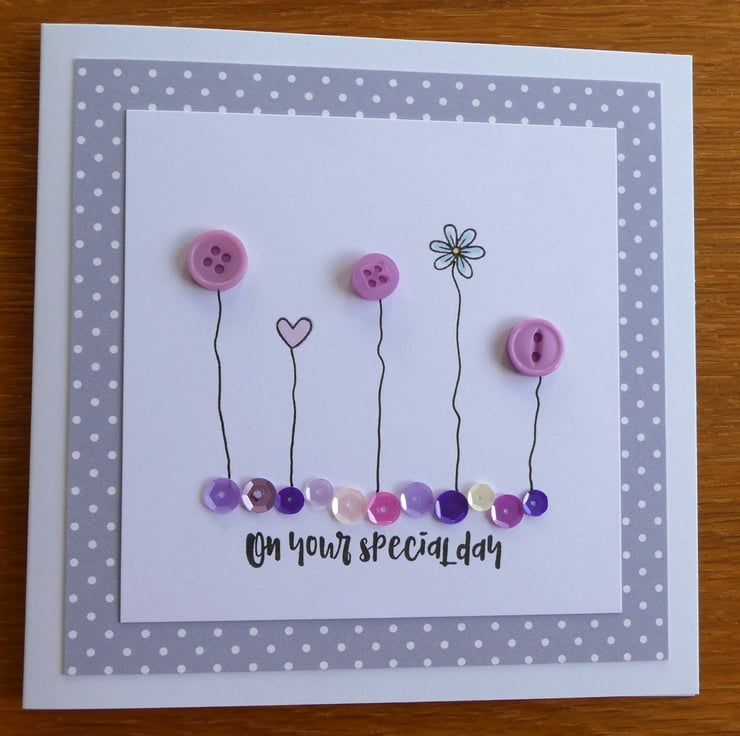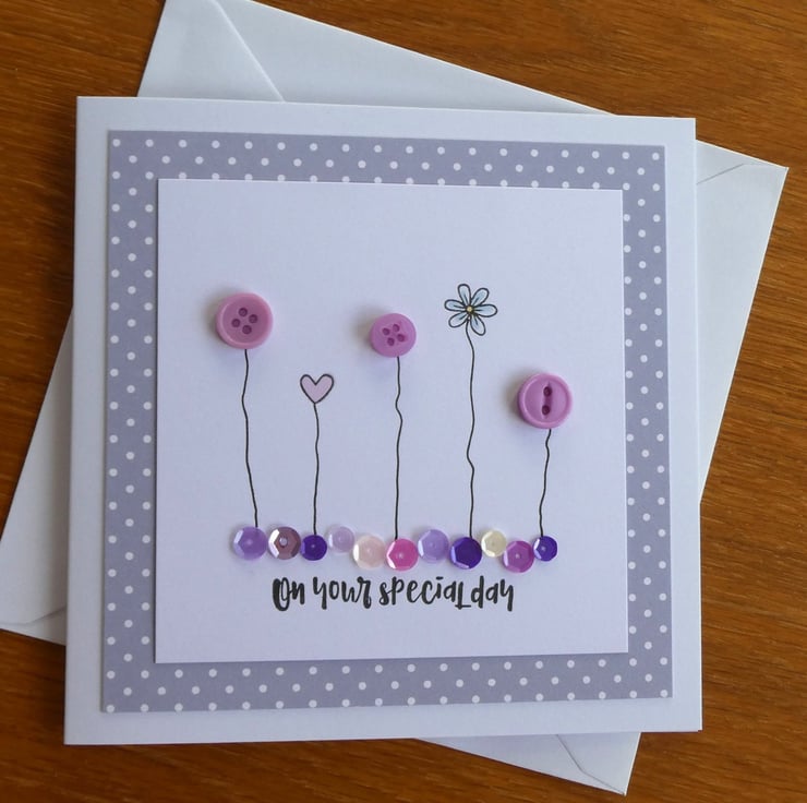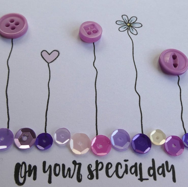 This pretty card has a row of buttons and hand stamped daisies and hearts, sitting above a line of sequins in shades of pink, purple, lilac and white and the message On Your Special Day. It would be ideal to send as a Birthday card, Anniversary card or to celebrate any special occasion.