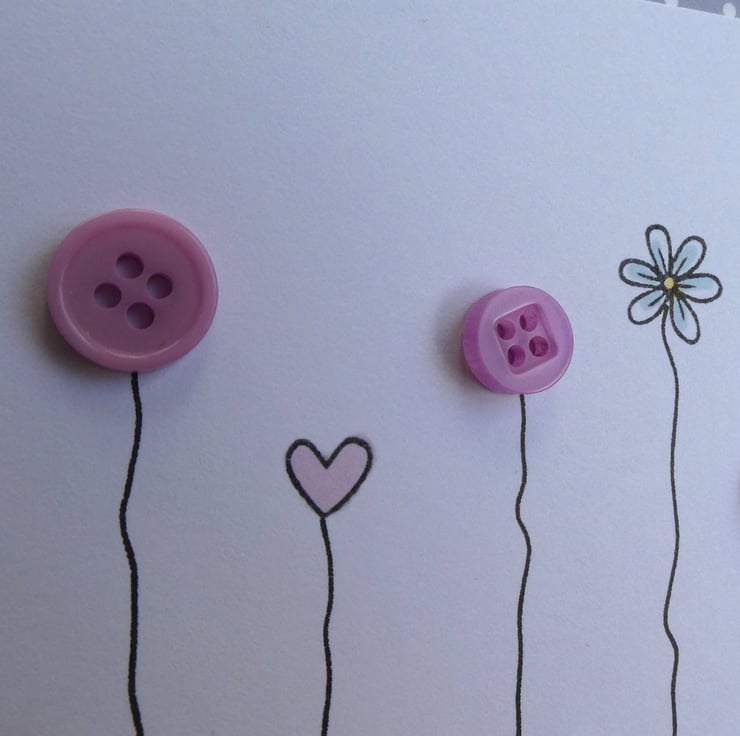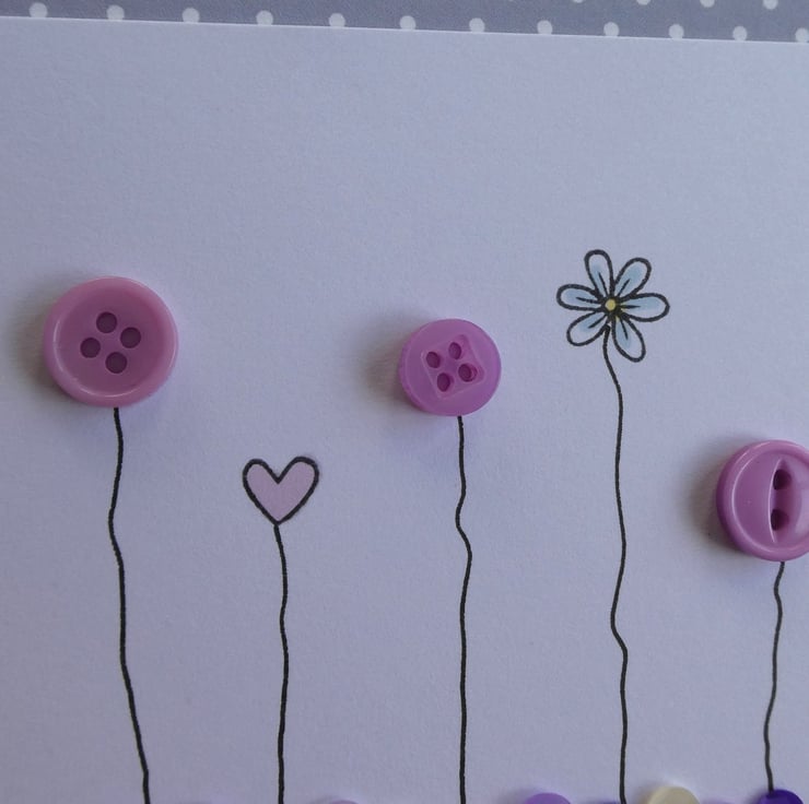 Three lilac buttons are mixed with a daisy and a pastel pink heart which have been hand stamped and inked. They have all been finished with hand drawn stems to connect them to a row of sequins in shades of pink, lilac, purple and white.