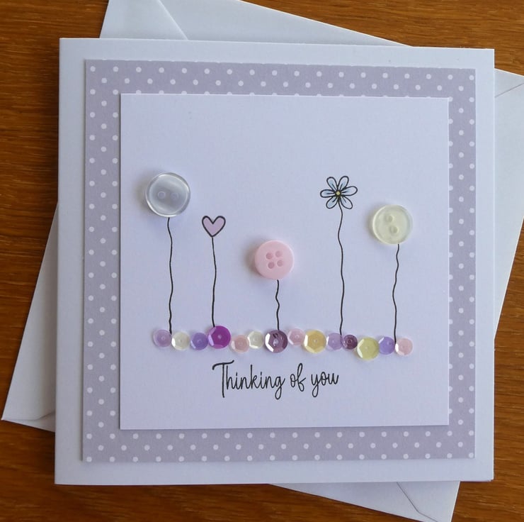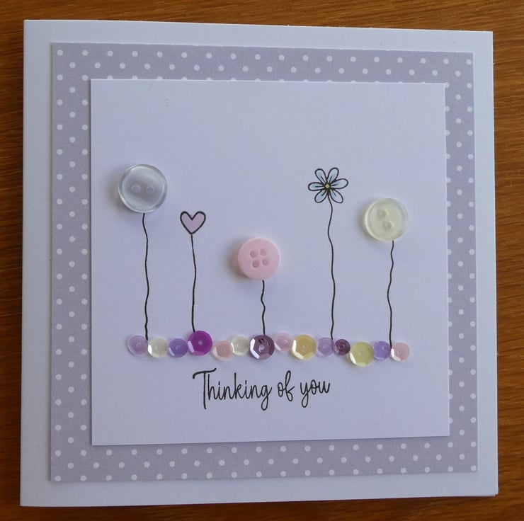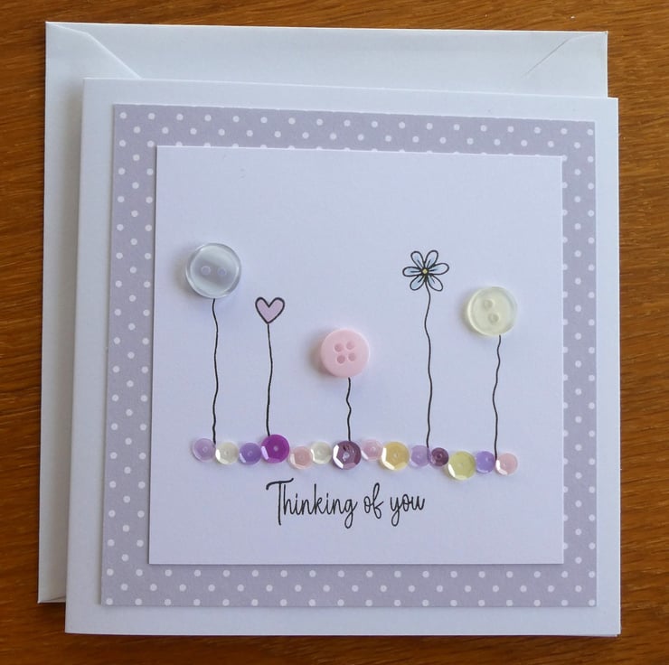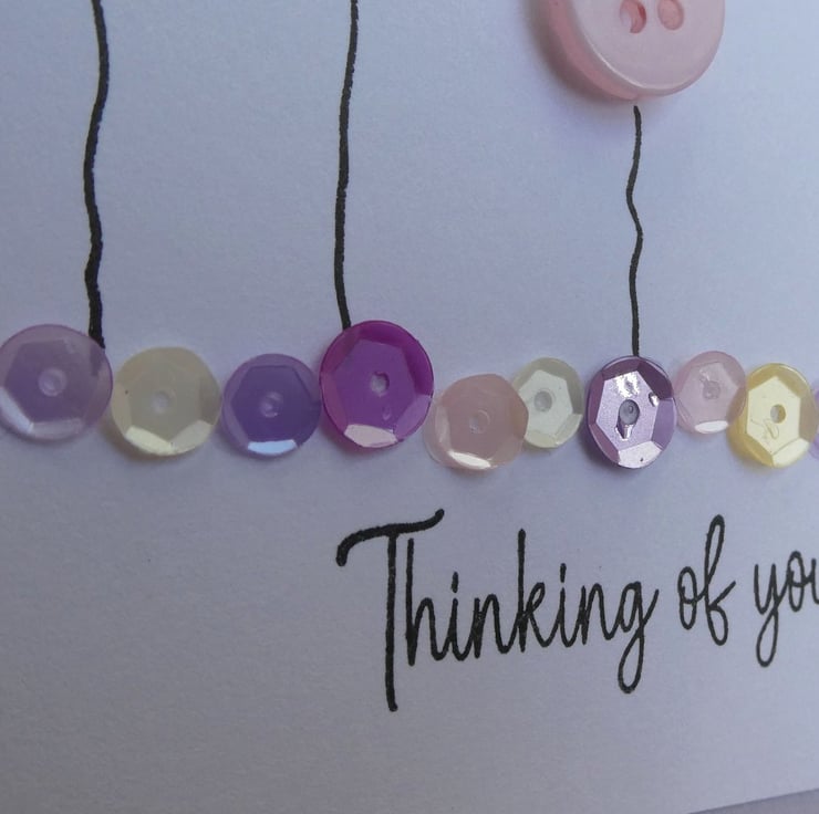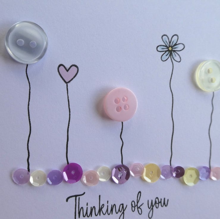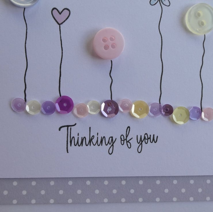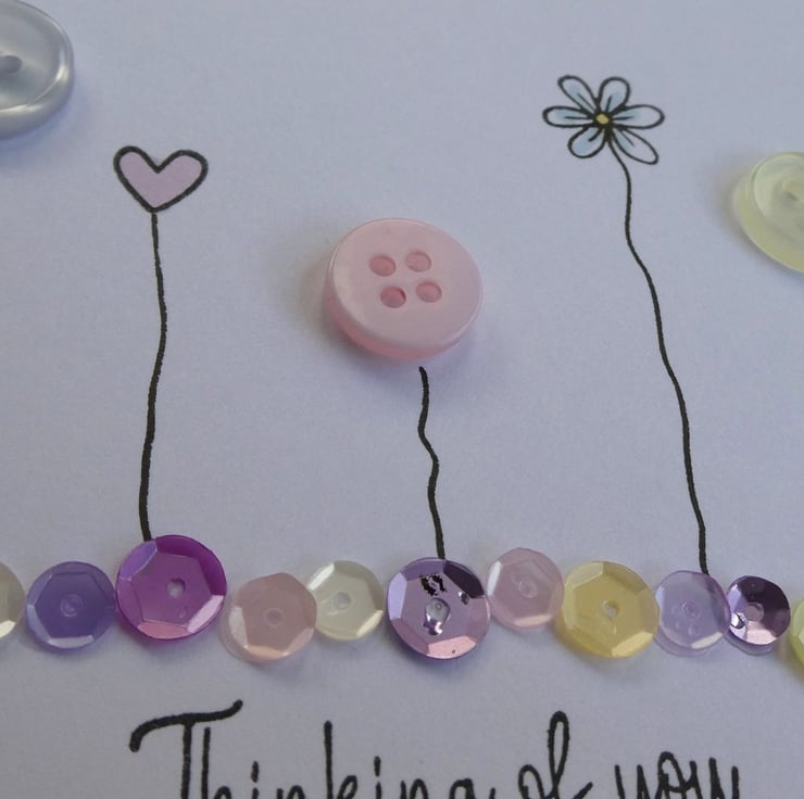 This pretty Thinking of You card has a row of buttons and hand stamped daisies and hearts, sitting above a line of sequins in pastel shades of pink, blue and lemon and the message Thinking of You. It could be sent as a Sympathy card, a get well card or just to send kind words.